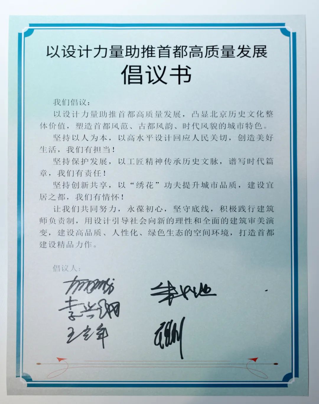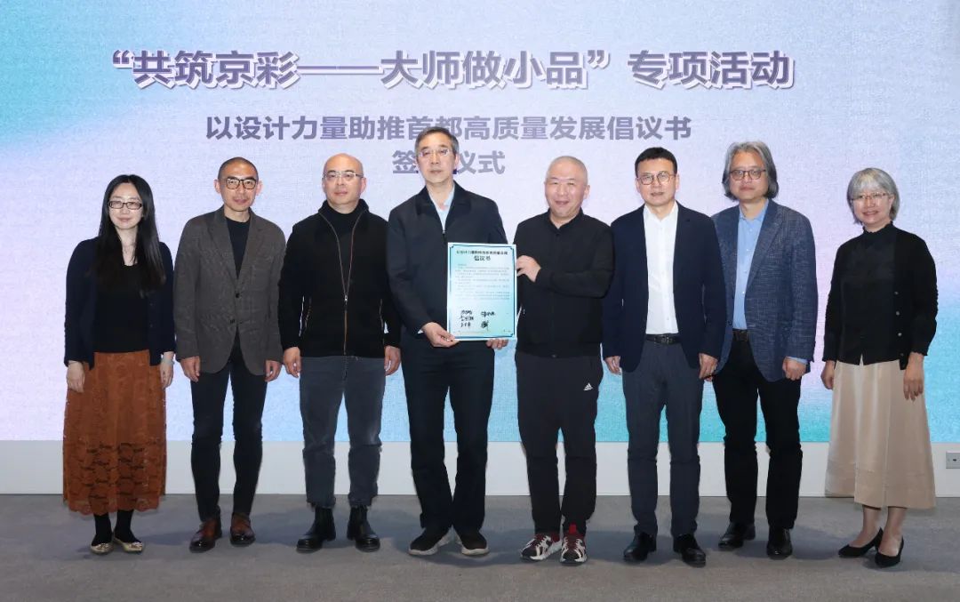 方案评审结束后,五位设计大师共同签署了《以设计力量助推首都高质量发展倡议书》,《倡议书》提出“以设计力量助推首都高质量发展,用设计引导社会向新的理性和全面的建筑审美演变,建设高品质、人性化、绿色生态的空间环境,打造首都建设精品力作”。