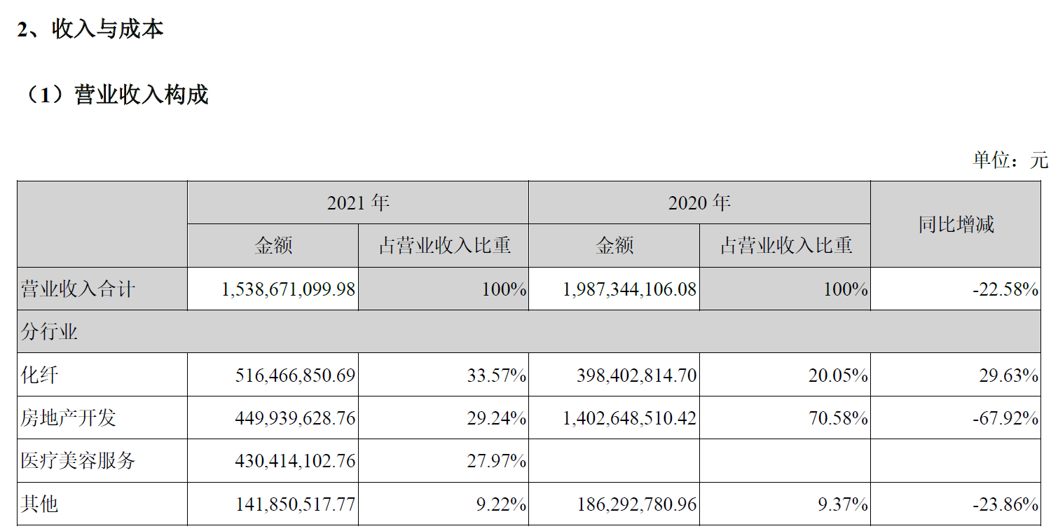 目前,奥园美谷营收构成分行业来看分别为化纤、房地产开发、医疗美容服务及其他。其中,化纤业务2021年营收达5.16亿元,为第一大主营业务,营收占比达33.57%;房地产开发业务实现营收4.50亿元,营收占比达29.24%,去年这一比例为70.58%;医疗美容服务实现营收4.30亿元,占比为27.97%。