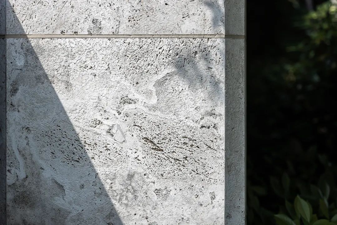 而在设计手法上,公望采用了传统的三段式做法,呈现水平舒展的态势。一层部分沿水平向展开,既是主体建筑的基座,也是建筑的主要形象空间。米黄色的洞石表面散布大小不一的孔洞,造型简洁却又质感十足,粗糙的纹理和孔洞仿佛沉淀着漫长的世事变迁,厚重之感油然而生。外立面采用洞石壁柱的做法,以强调和烘托建筑的体量感。