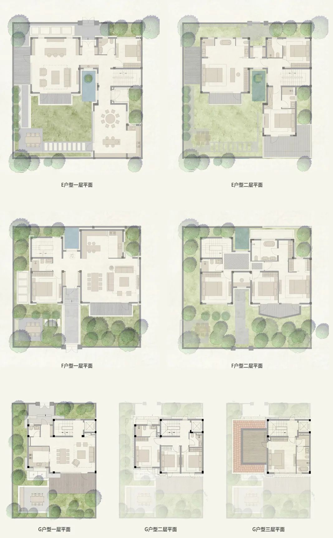 本区块采用了两层合院作为主力户型,顺应地形变化,呈现两拼到四拼的不同变化,另外局部设置少量三层联排。在保证外部公共空间骨架明晰,收放有序的前提下,仍尽可能地为住宅挖掘资源,保证产品的舒适度。
