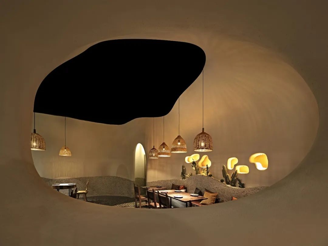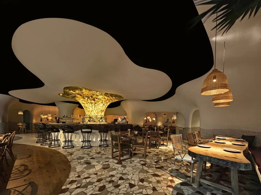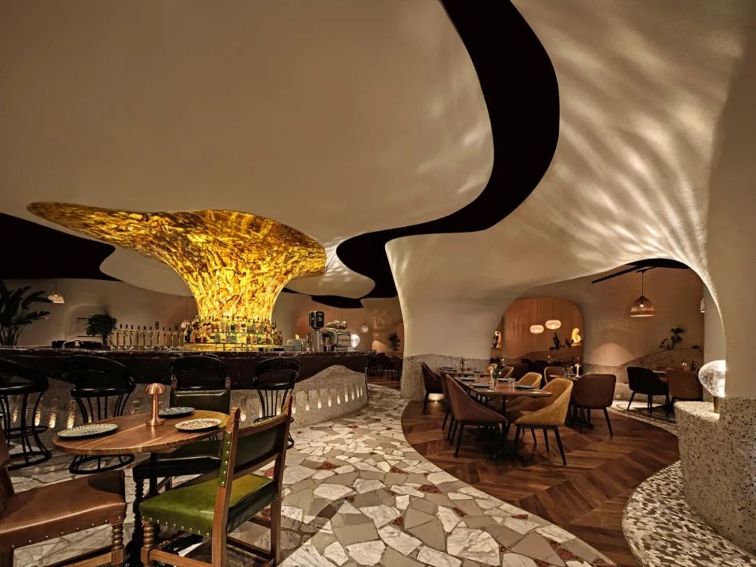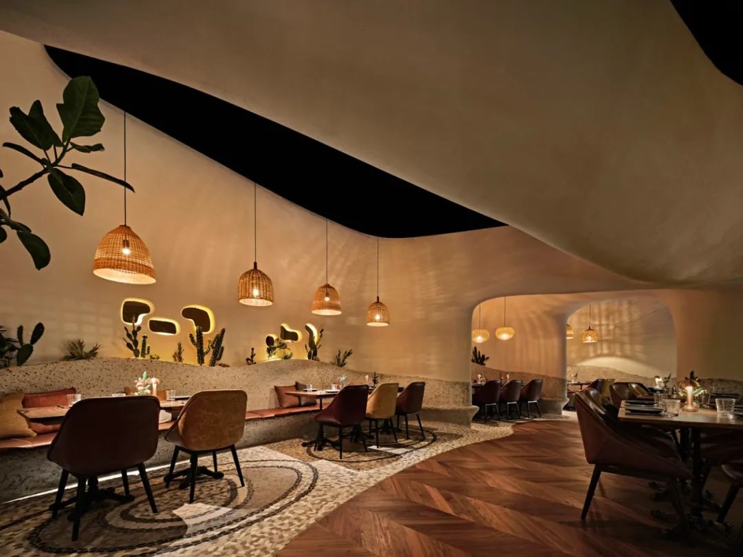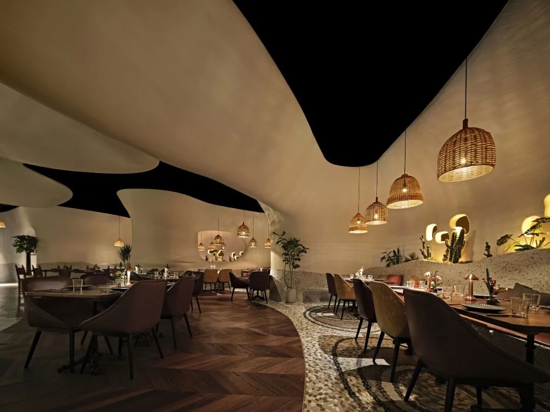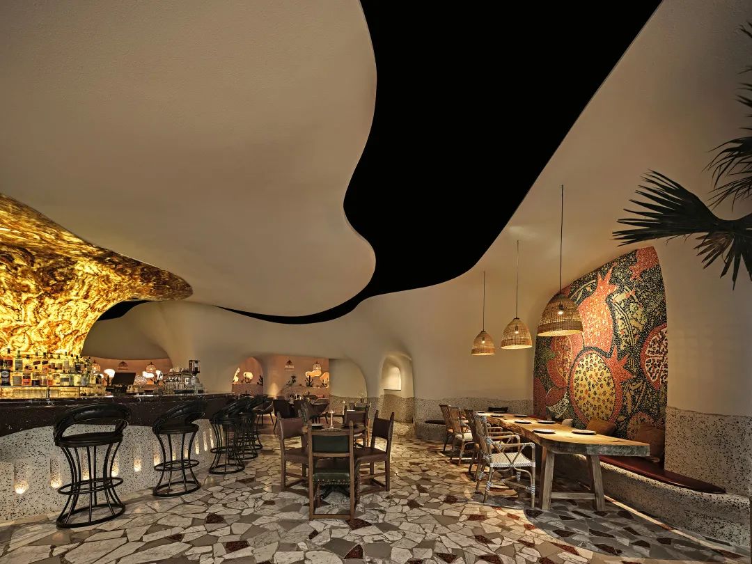 室内整体用餐区域以“海洋洞窟”的概念自然联结,不规则地柔软曲线将天花与地面相应地划分为不同区域,也由此让圆形围合成一个个大大小小的用餐区,自然地划分出不同的用餐体验。远古文明的意向,如洞穴、穹顶、壁画,被大量地置入空间之中,这样充满浓郁性地场域气质,也让落座的食客们产生微妙地情绪变化,进而放松下来,在点状光源制造的静谧氛围中,享受美食好酒与难得的欢聚时光。