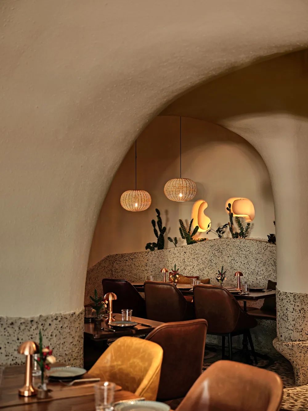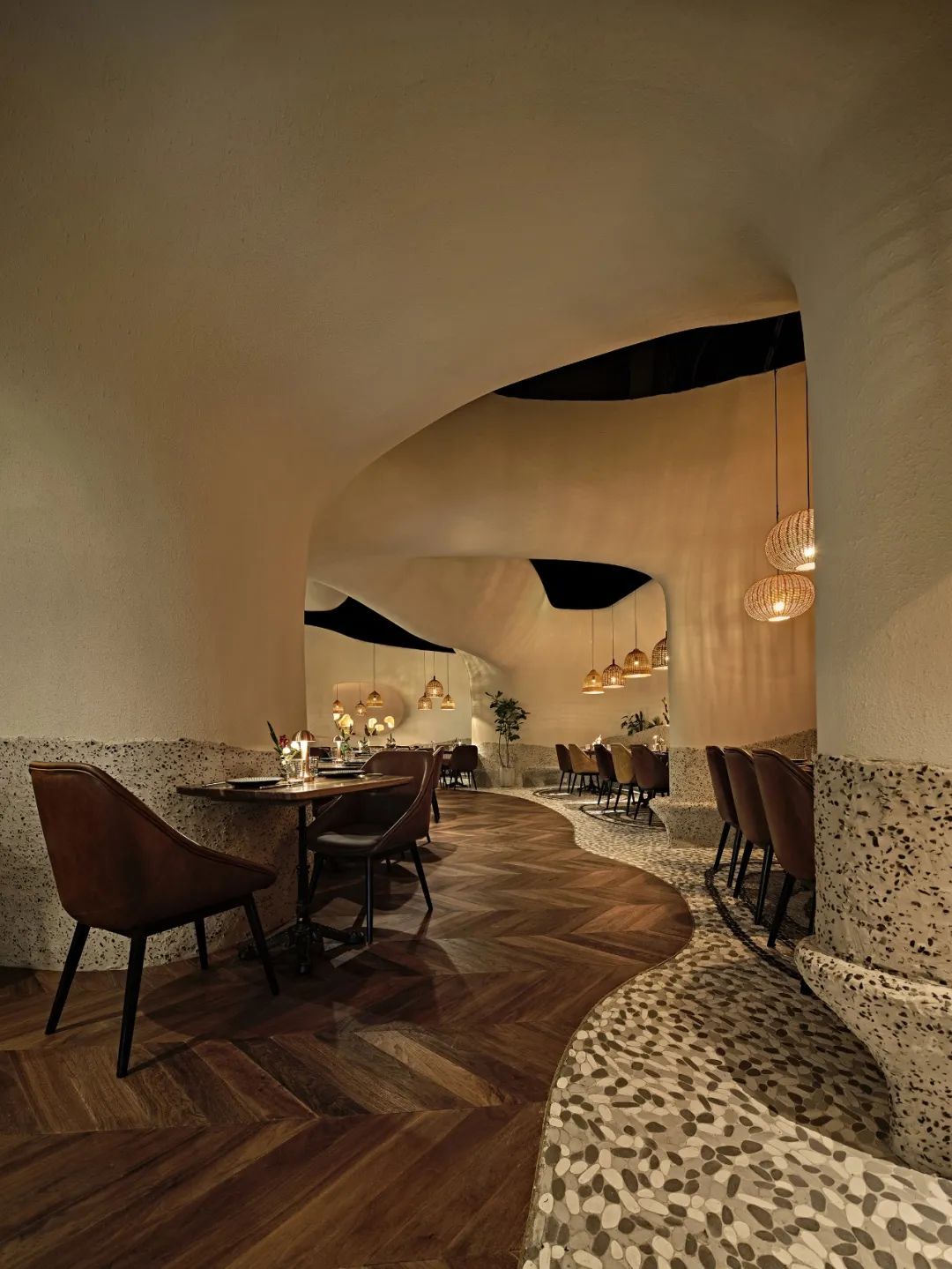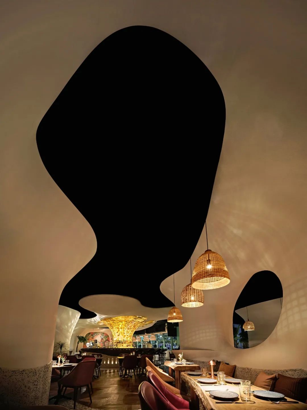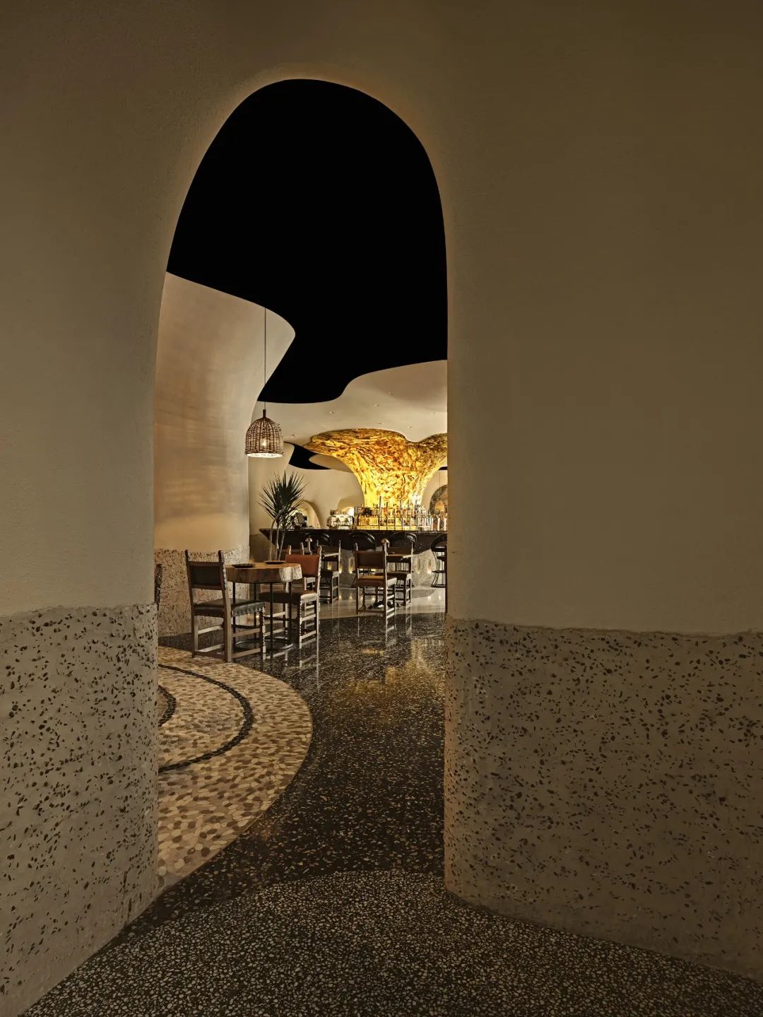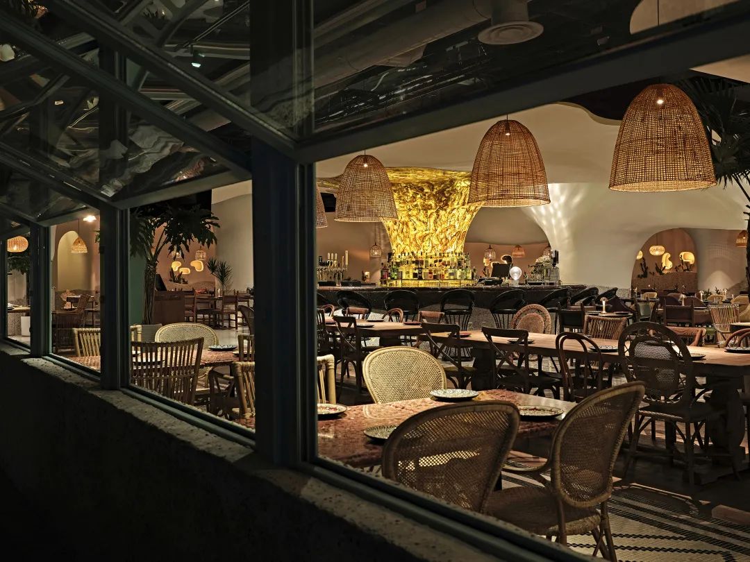 室内整体用餐区域以“海洋洞窟”的概念自然联结,不规则地柔软曲线将天花与地面相应地划分为不同区域,也由此让圆形围合成一个个大大小小的用餐区,自然地划分出不同的用餐体验。远古文明的意向,如洞穴、穹顶、壁画,被大量地置入空间之中,这样充满浓郁性地场域气质,也让落座的食客们产生微妙地情绪变化,进而放松下来,在点状光源制造的静谧氛围中,享受美食好酒与难得的欢聚时光。