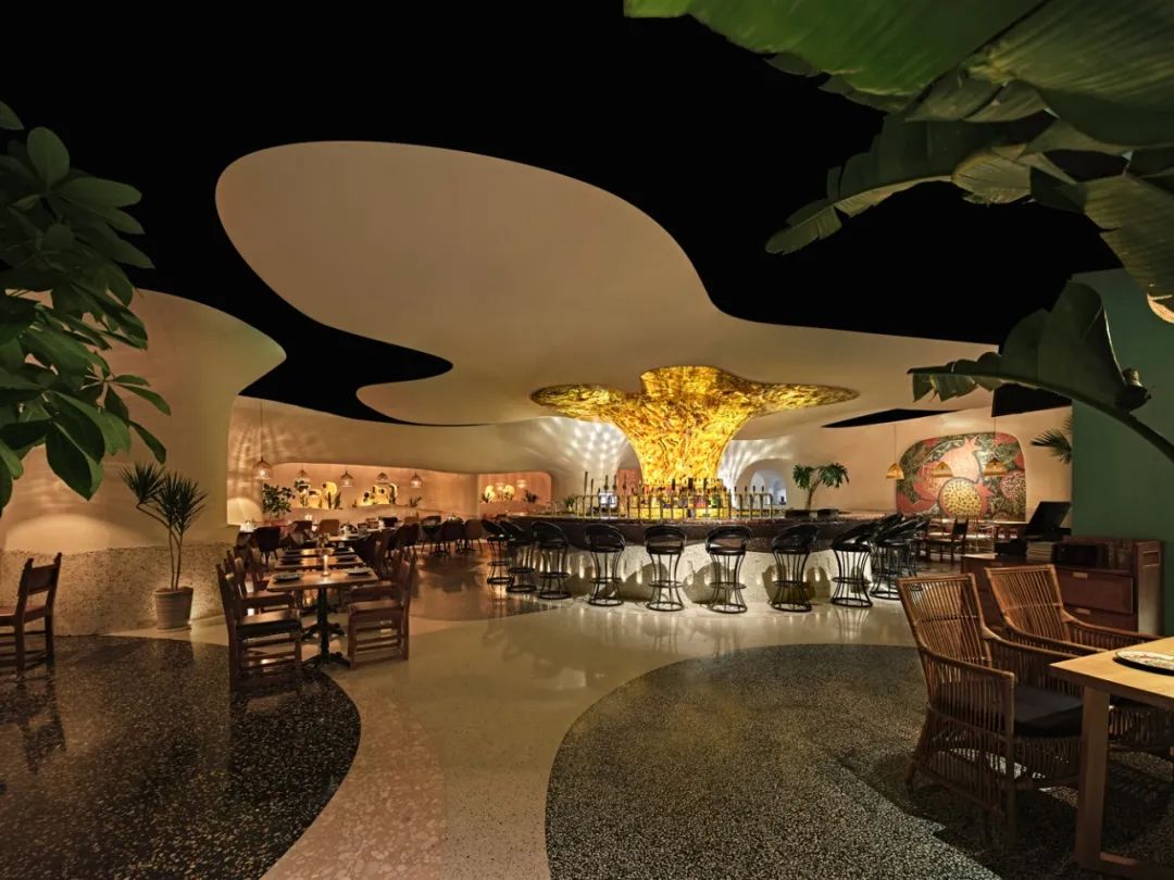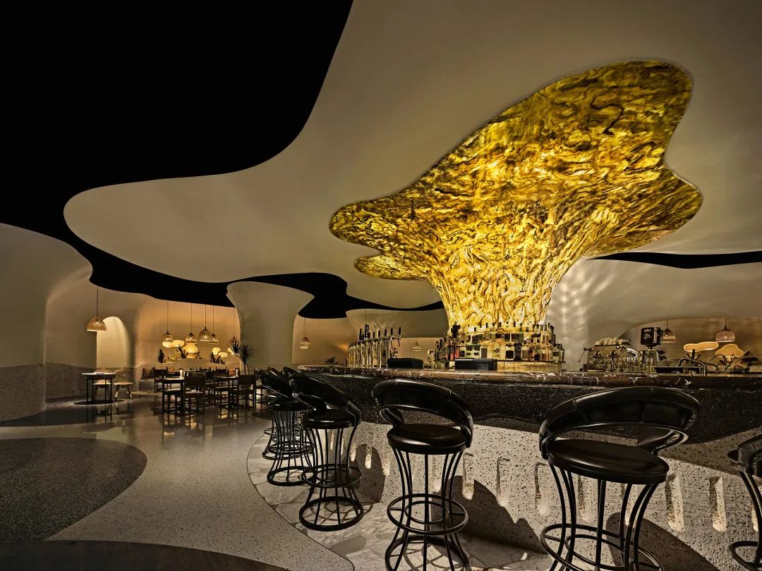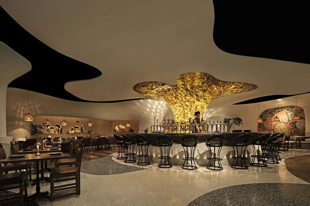 人们进入室内用餐区后,视觉中心自然会落在中央那联结“天地”的“生命之树” 上。这个位于不规则圆形吧台的柱状“树干”透露出琥珀的本色,枝干自然地伸展蔓延,在夜间更像是一株充满生命原力的火炬。围坐于这个支撑整体空间的能量聚点,无论把咖啡闲聊还是把酒言欢,交流围绕这个耀目的生命体下,仿佛回荡出了迷人的时光香气。
