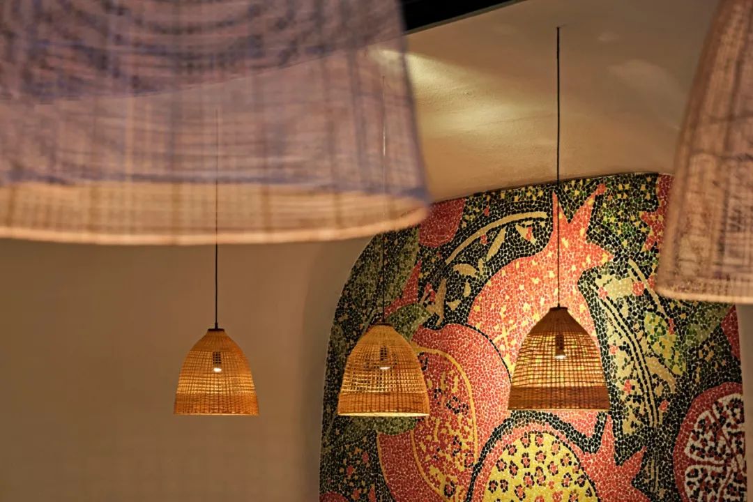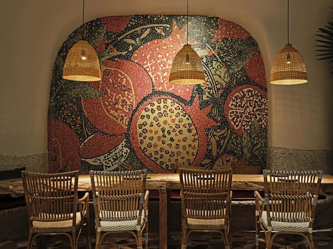相对于当下流行的侘寂风当中,以使用单一材料和极为严谨地方式布局计算出的禅寂感,兰巴赫几乎是以反其道而行成的方式触达了另一种缤纷感。兰巴赫室内空间中使用的材料非常丰富,光是地面就使用了拼花磨石子、实木地板、碎拼大理石、 鹅卵石地面、拼花马赛克等多材料组合,最终呈现出像是一幅拼贴艺术画一样的视觉感官。