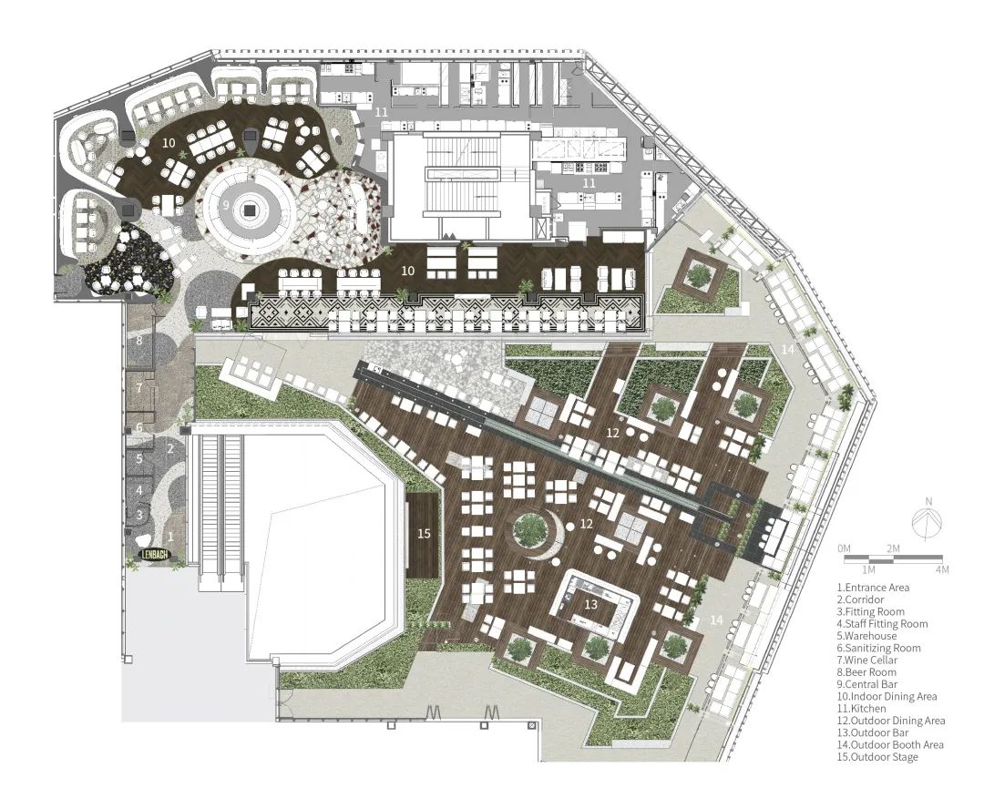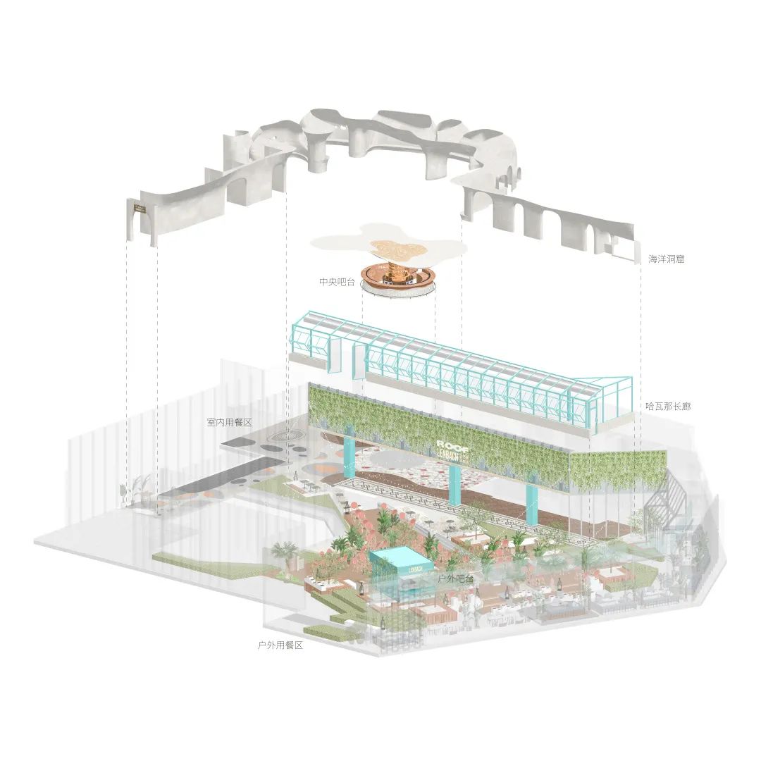餐厅身处魔方商场之上,设计师用一段长廊帮助人们完成情绪的转换,从零售空间抵达建筑顶层的过程,也是从当代社会的喧嚣热闹去往远古引力场的过渡。从整体上分为室内开放用餐区,中央吧台区,周围卡座区,阳光长廊以及一个露天花园用餐区。