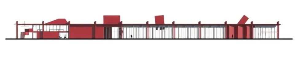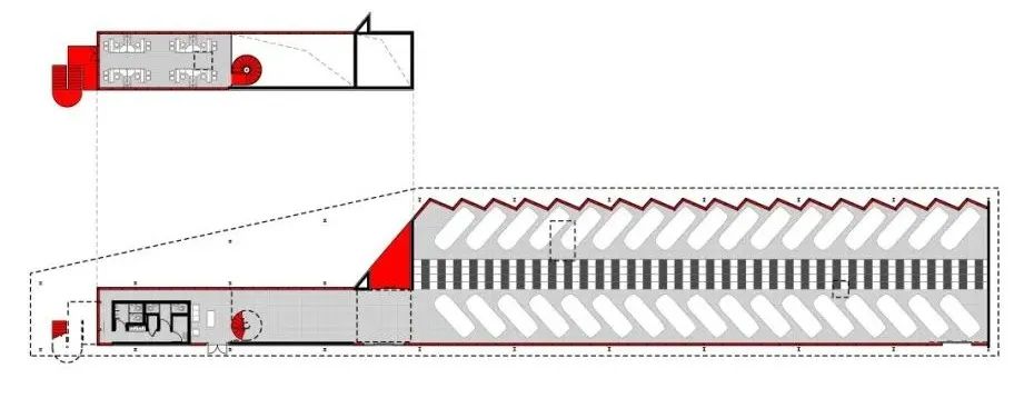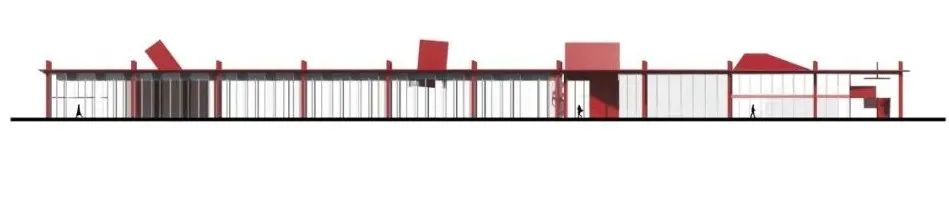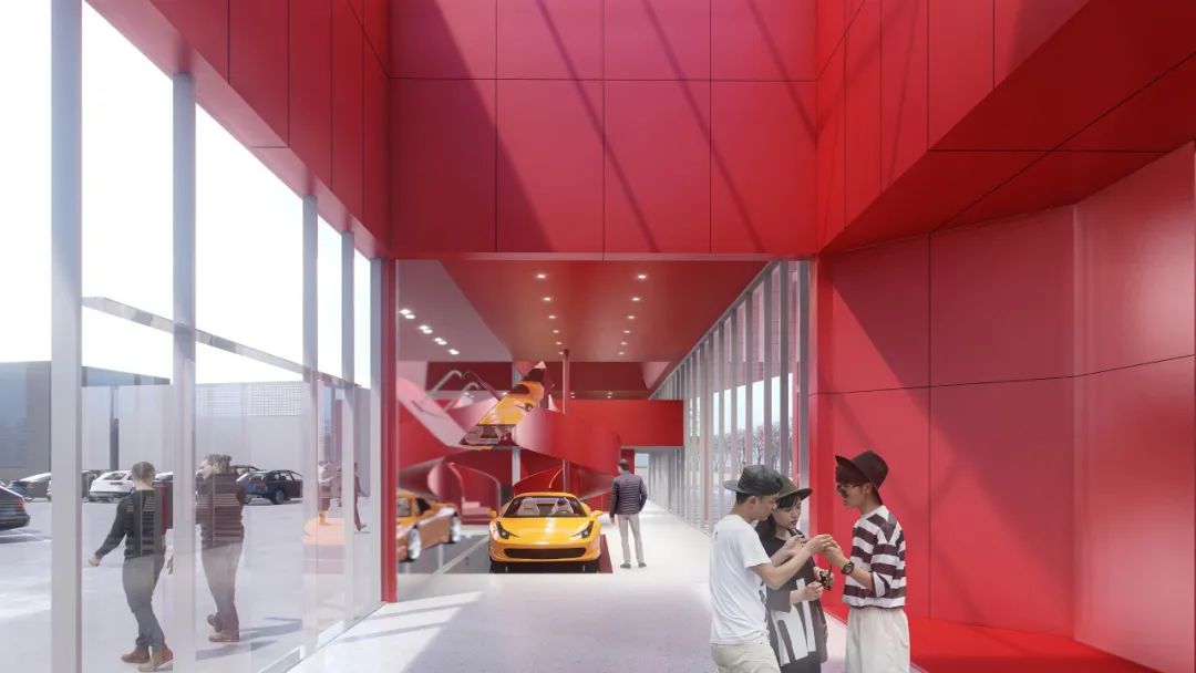展厅二的体量约为展厅一的一半,我们采用了锯齿状屋顶,与立面形式统一,视觉上再次强调了展厅空间的锯齿元素。工厂棚屋式的屋顶景观和侧窗也为室内空间带来了柔和均匀的漫射光照,形成最佳展陈效果。我们赋予两座展厅同样的红色基调,作为宏盟交易市场在两个道路交汇口的独特标记,强化了顾客对交易市场的识别度与记忆点。