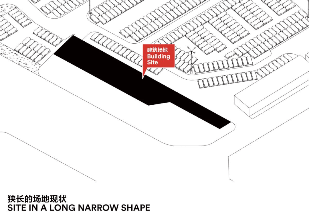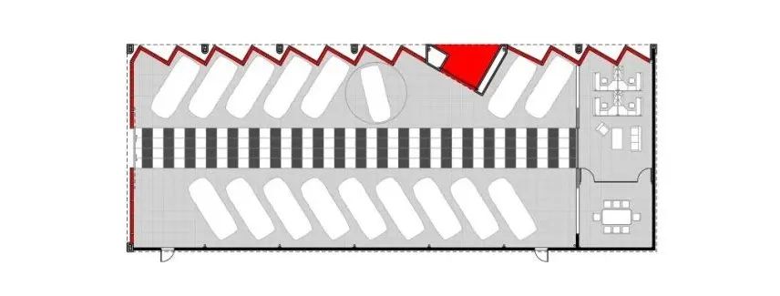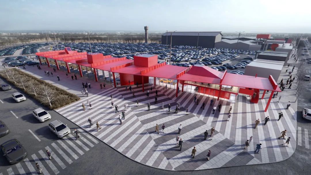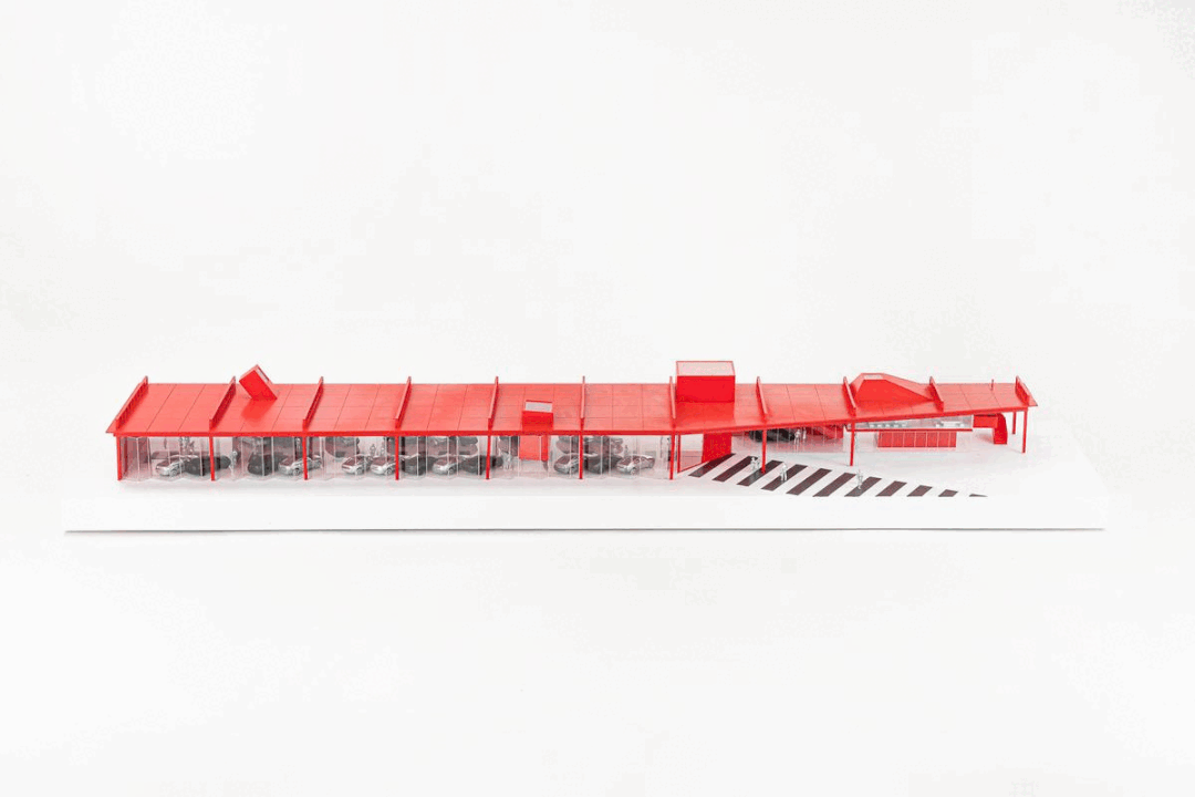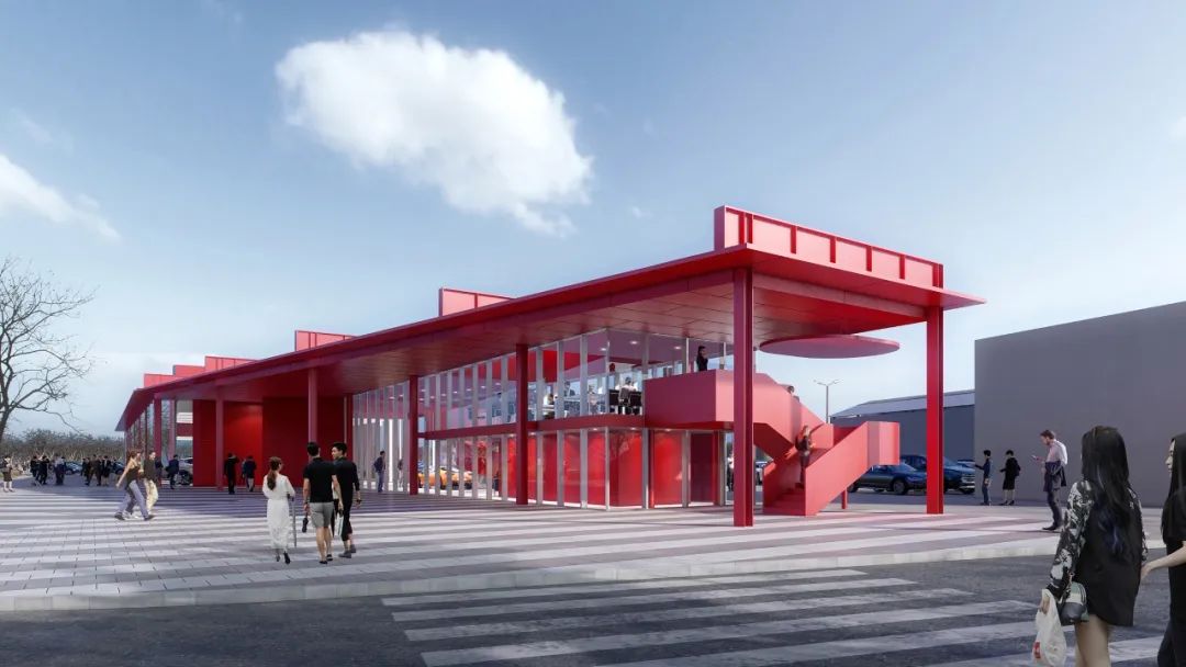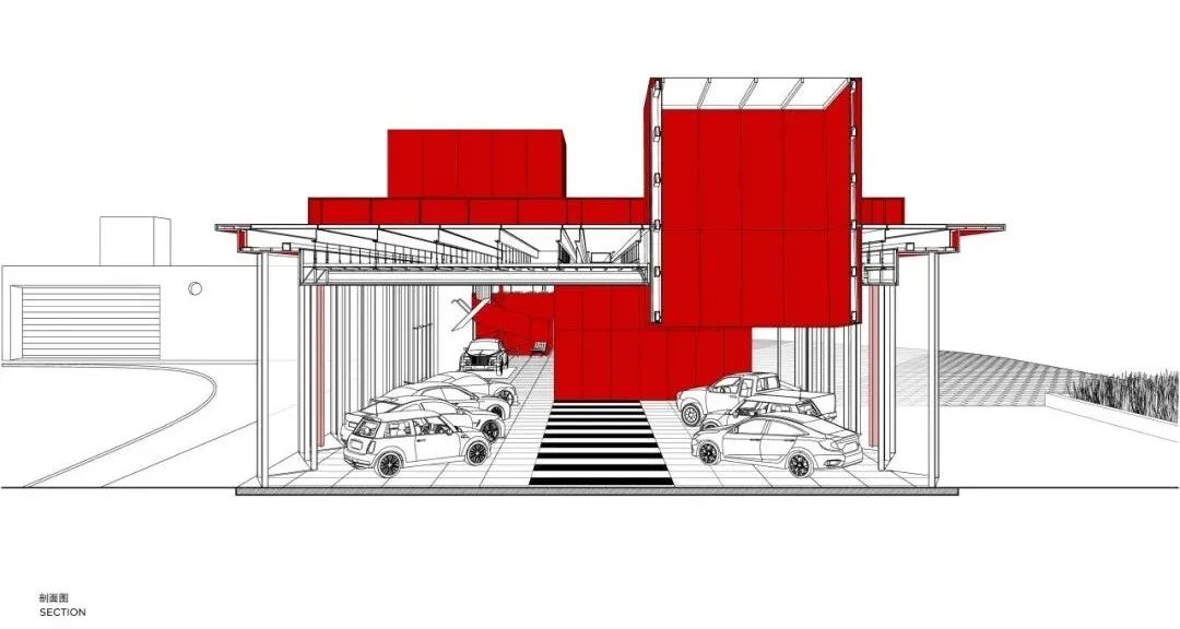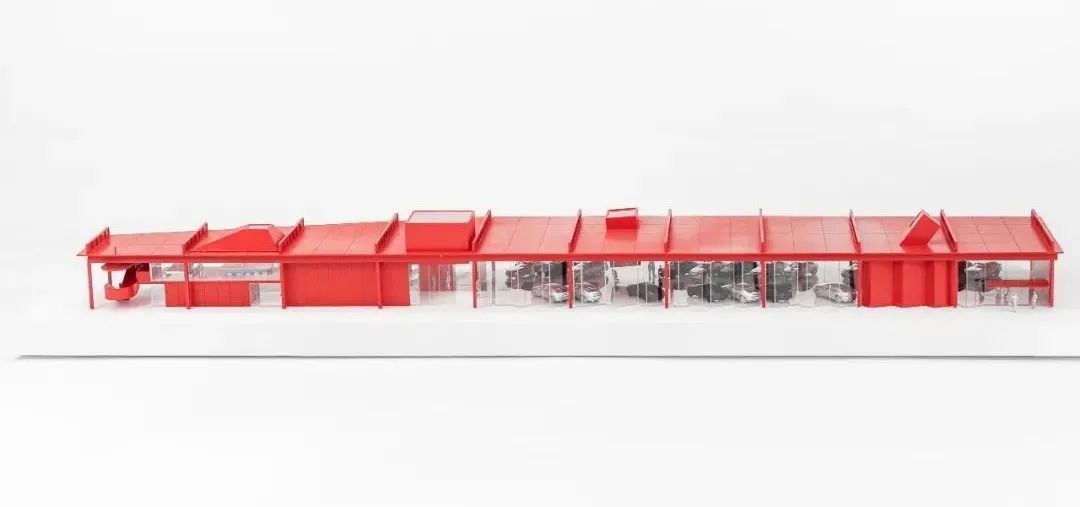 Showroom 2 is approximately half the size of Showroom 1 with a zigzag-shaped roof, which adopts the same language as the façade and re-emphasizes the zigzag element. The side windows of the roof also provide soft and even diffused light to the interior space, creating the best possible display effect. The same red tone has been given to both showrooms as a distinctive marker at the intersection of the main roads, reinforcing the visitor’s identification and memory of the market.