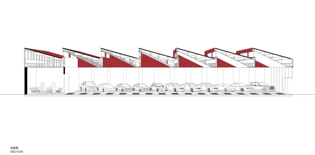 有光泽的金属与玻璃作为两种主要材质来构建展厅的内部空间。在有限的场地内,以锯齿状斜向停车位的设计保证了展示的最大效率。同样到访者也能因此获得浏览展车的最佳视线。展车区域的立面以直白简洁的落地玻璃幕墙为主,通透与反射的玻璃交替组成了幕墙锯齿的两面,形成了丰富的视觉效果。
