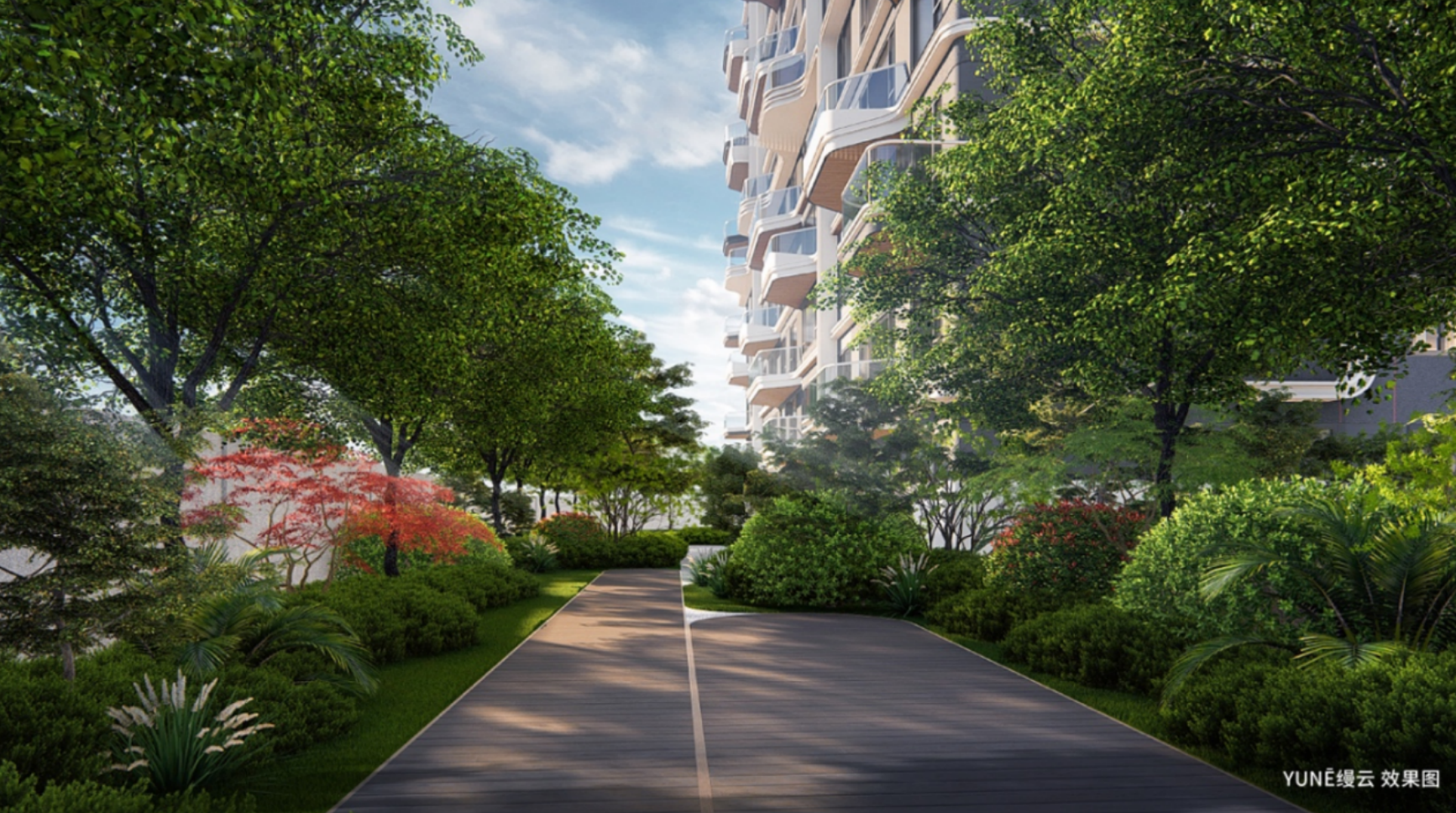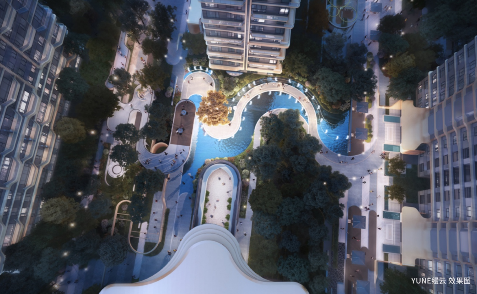 缦云创新打造的“折叠园林”体系,将景观动线及中心水景设计中结合“祥云”的云纹曲线,唤醒人们对于文化的归属与情感的共鸣,感召人们自然地顺应空间流线去参与融入,收获至简至美的平和与优雅。在移步异景中交融“逐云入境,顺水而流”的美好生活意向。