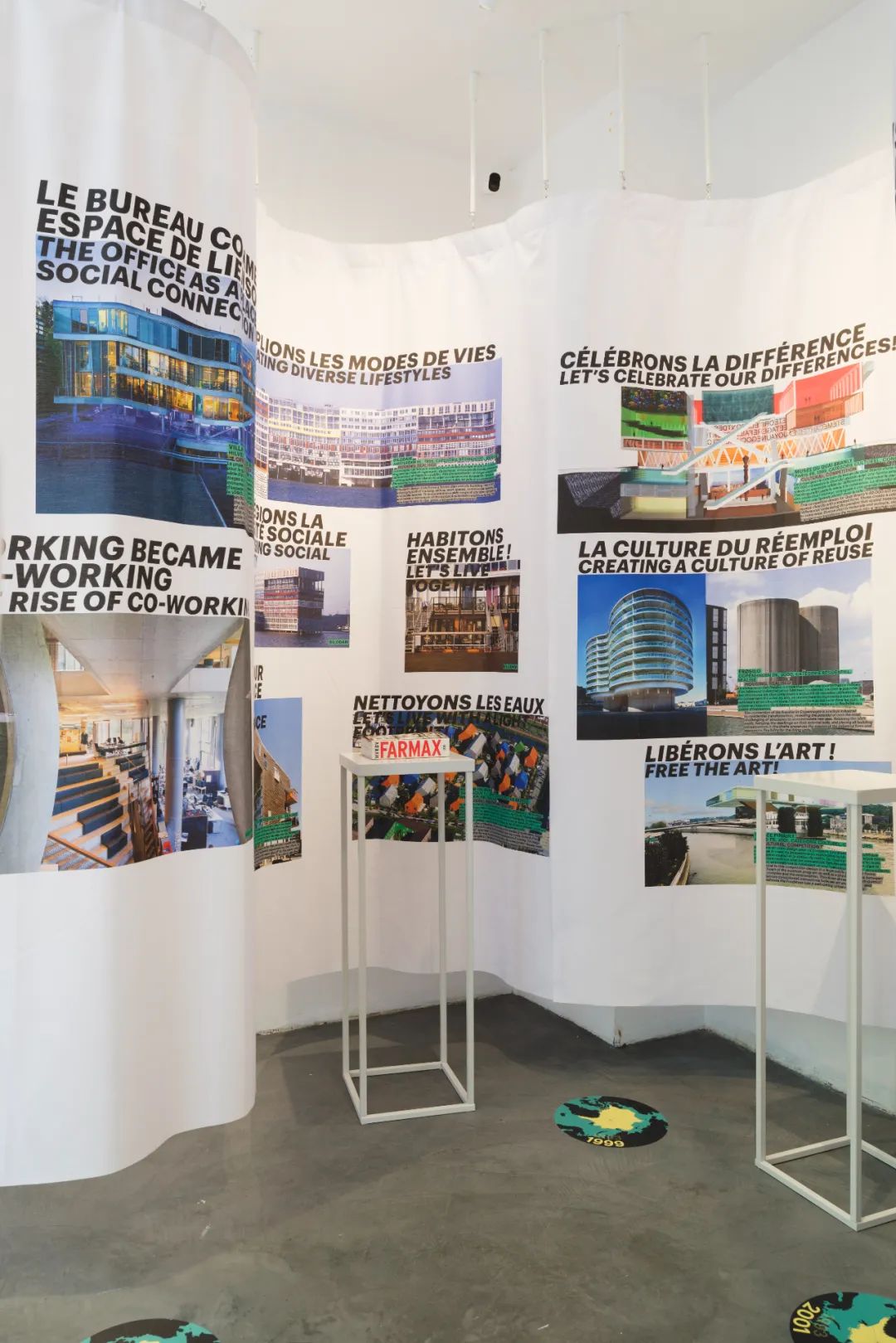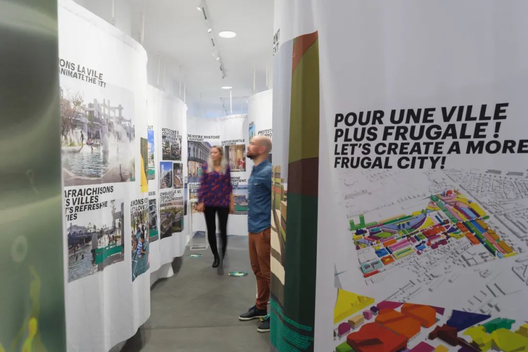 展出的项目按时间顺序印刷在一卷长78米的织物上,通过弯曲和折叠,在紧凑的展览空间中传递出密集的信息,强调了应对影响社会、环境和整个世界面临的挑战所迫切需要采取的行动。为了强调挑战的紧迫程度,根据项目的时间进度,在地面上标注了对应时间极地冰盖的变化图示。展览延续至展厅的后方,直至MVRDV巴黎办公室的一层空间,以巴黎艺术家工作室的风格展示了事务所目前正在进行的项目模型。