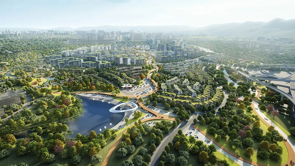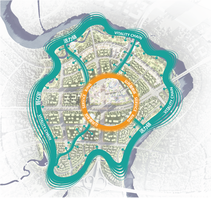 设计将基地一分为四,中央结合轨道15号线现代大道站打造TOD商业核心区,并于核心区外沿构建包含社区医院、社区服务中心等在内的公共服务环,与分布四周的听溪谷、御临湾、观水岸三大智慧主题社区共享基础配套设施。 同时依托基地外围三条水系及景观公园的景观优势,沿基地外沿打造了以生态为基地,串联主题商业、公共空间节点的活力链,并通过一系列活力廊道与中央的公共服务环形成连接,实现公园与城市间无界联通的同时,形成以 TOD为核心的多维连接。
