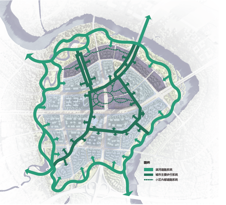 四条廊道将两条不同功能的步行环连接成完整的步行网络系统