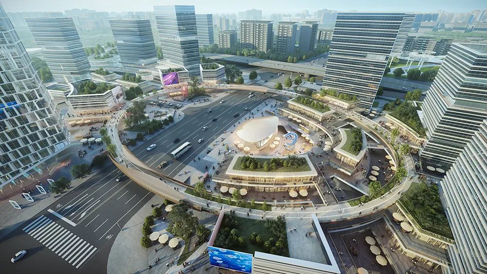 设计以轨道交通站点为基础,构建了一套立体步行系统。 地下交通层充分强化与地铁的交通接驳,通过下沉广场将地铁人流自然导向地下商业与地面空间;而地面的公共商业休闲层通过广场空间、商业退台,为市民营造出丰富的公共空间,多元互补的商业业态与场景式体验,为核心区注入活力与生机;同时空中生活层通过独具特色的环形景观天桥,将三个商业地块各地块与多元业态无缝连接,营造地标打卡点的同时,以立体开放的动线设计,使人们可以在地块之间随心漫游,快捷通往周边社区以及外围的公园。