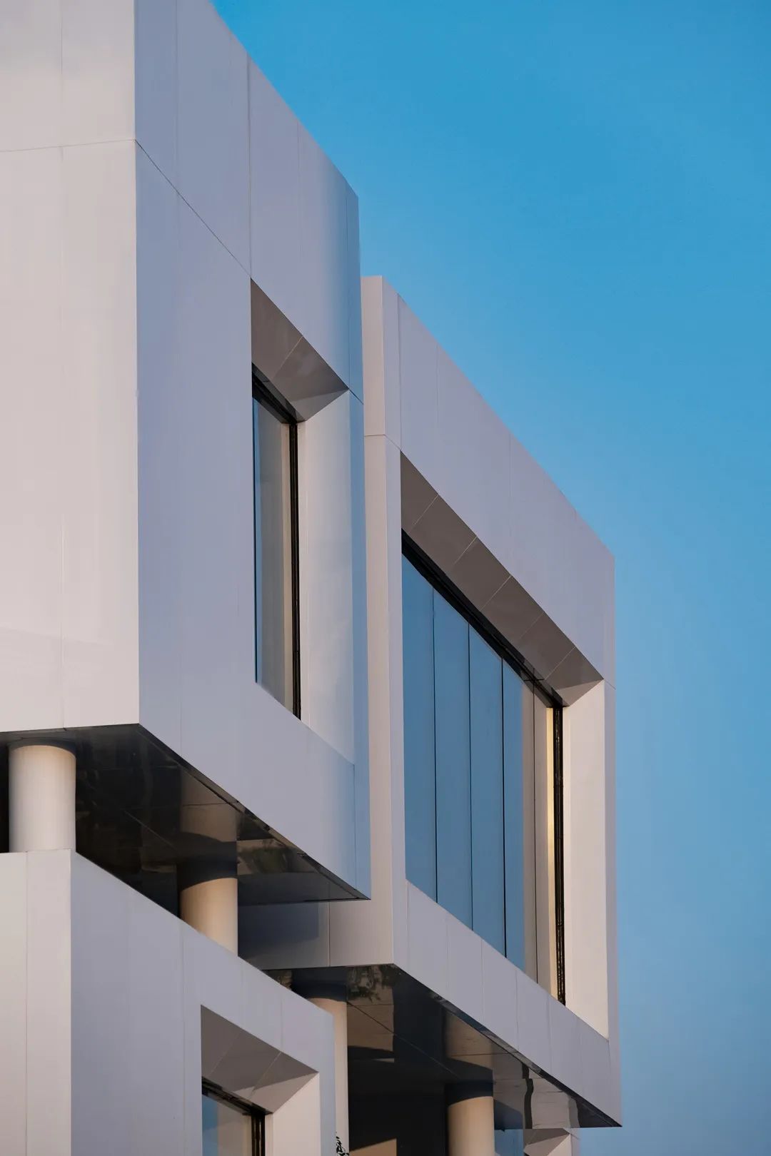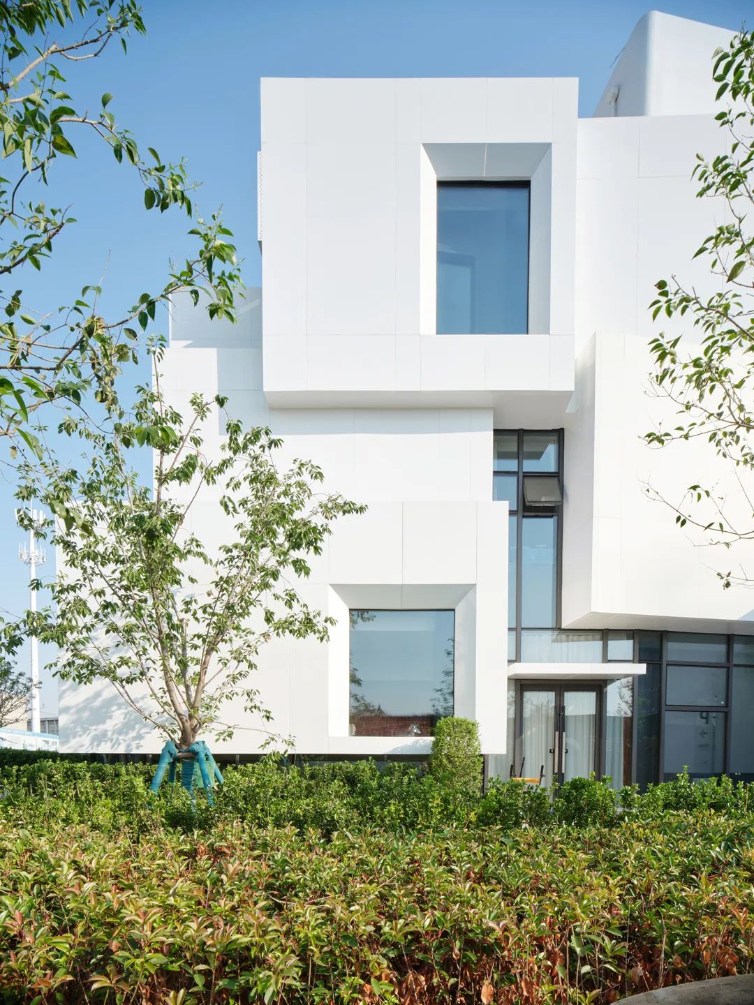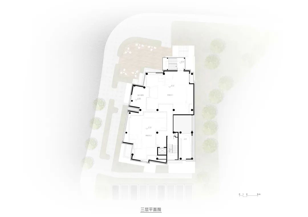 为了避免3层的结构限高规定使这座“山”被拦腰截断而变成平顶山,我们在屋顶上继续用盒子收分堆叠,在视觉上形成一个完整的“山”。原本每个盒子就是一个平台,客人可以拾阶而上到达顶峰,这个时候便可以四下凭望,一览形胜。但因为“可上人平台”和“不上人屋面”直接影响结构限高判定,以及建筑面积判定还有严格的造价控制,最后塑造山顶的盒子只能变成构筑物。尽管无法从地面踱步到山顶但也完美地把屋顶的设备给遮挡了。