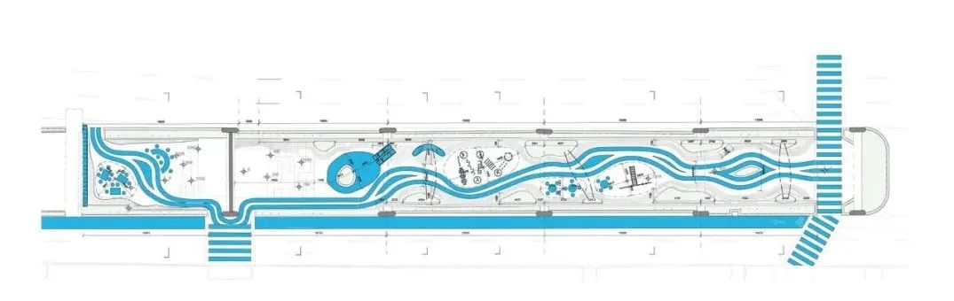StudioPOD首先完成了交通以及道路两旁街景优化,规划平面、确定目标群体。在此基础上,MVRDV设计了蜿蜒曲折的蓝色条纹,贯穿空间内的所有元素,形成有凝聚力的视觉系统,打造一座提供愉悦氛围并具有整体性城市空间体验的「绿里乐园」。