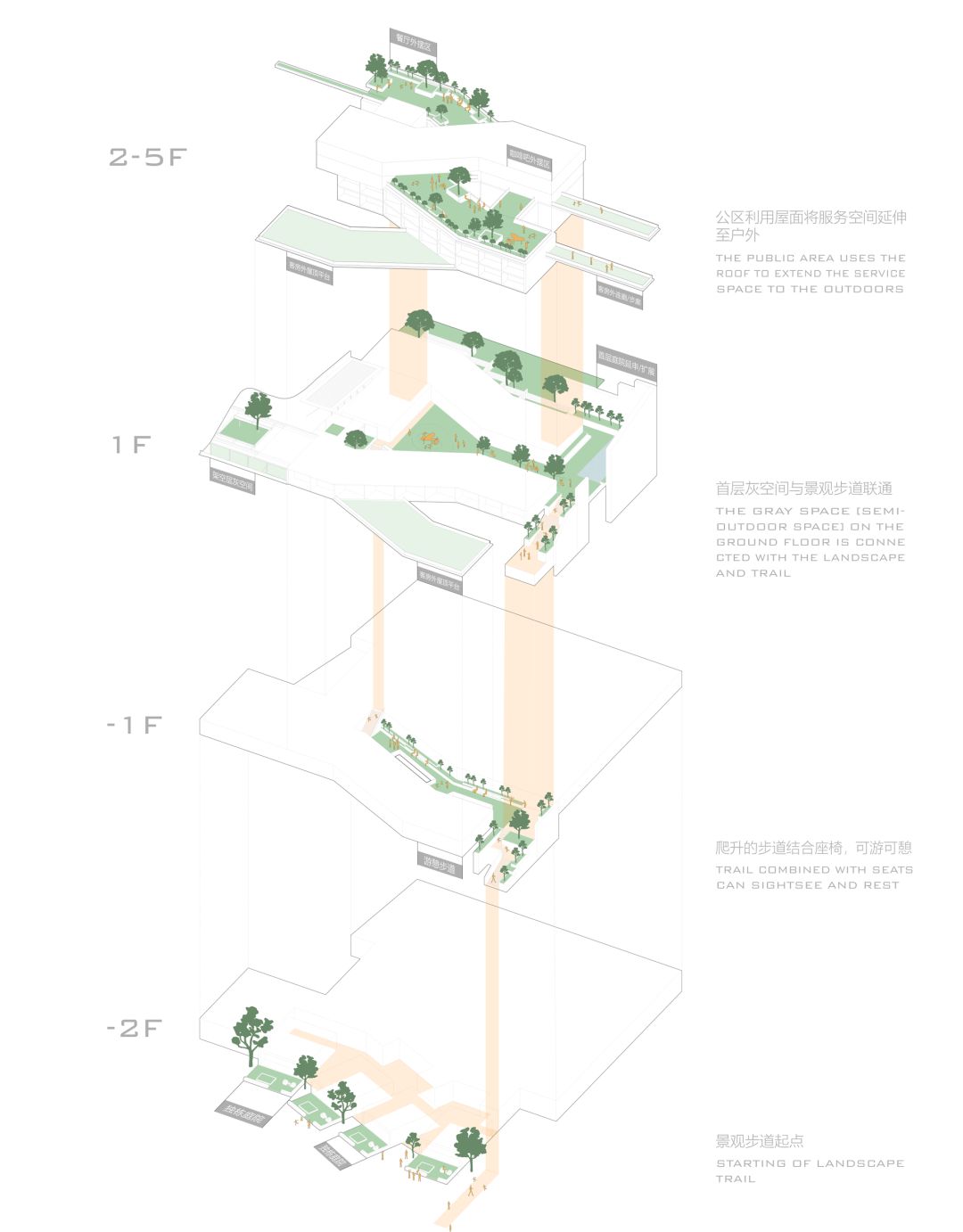 形体错动创造了立体景观平台,与竹林山径平缓串联,为青峦居打通一条行走于山林间的开阔步行长廊,游客可饱览泊岸湿地与山林全貌。从西侧的室外台阶拾级而下,进入溪岸边的农田,感受闹市之外的山野意趣。