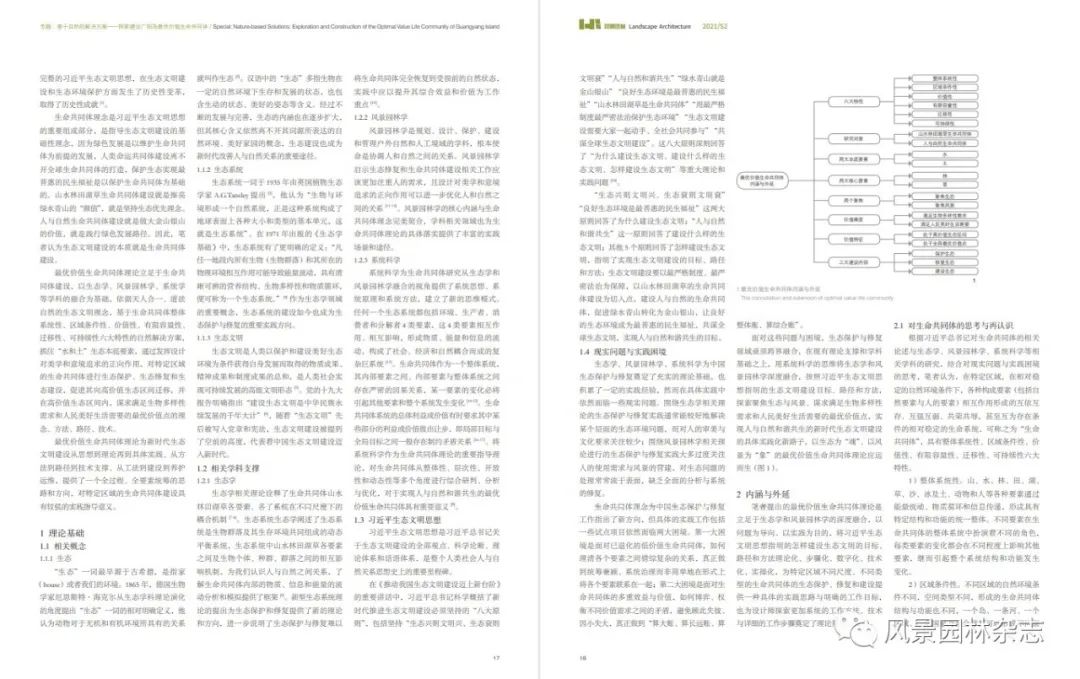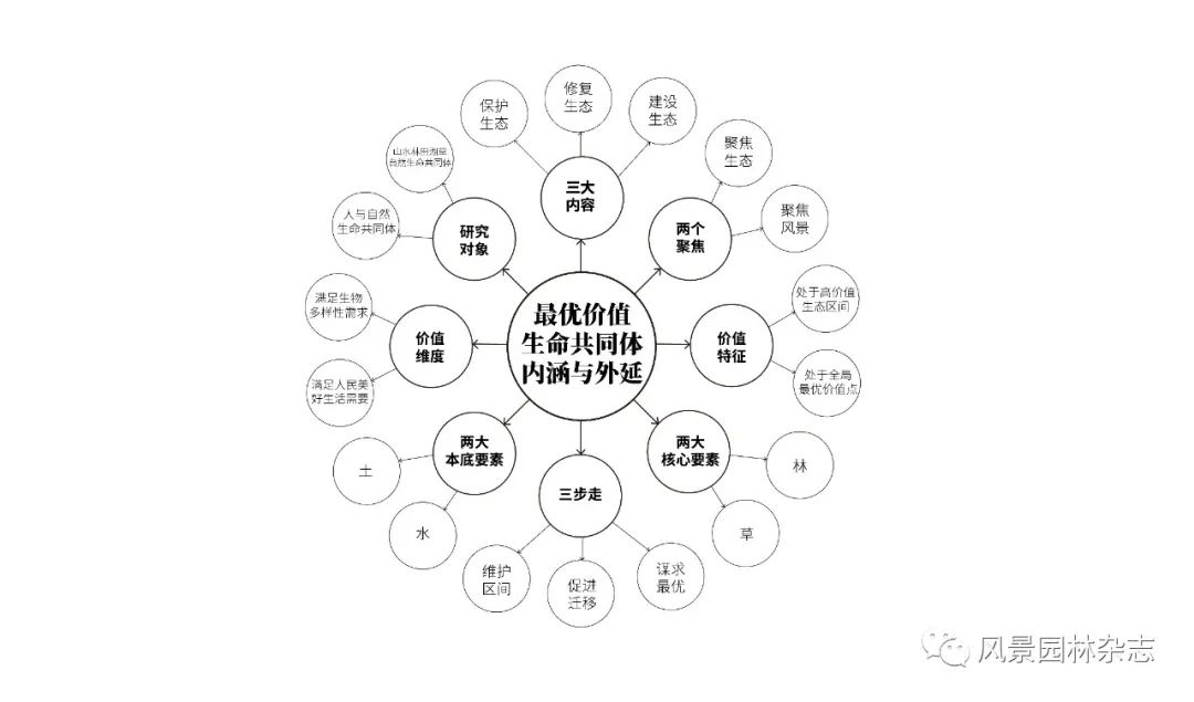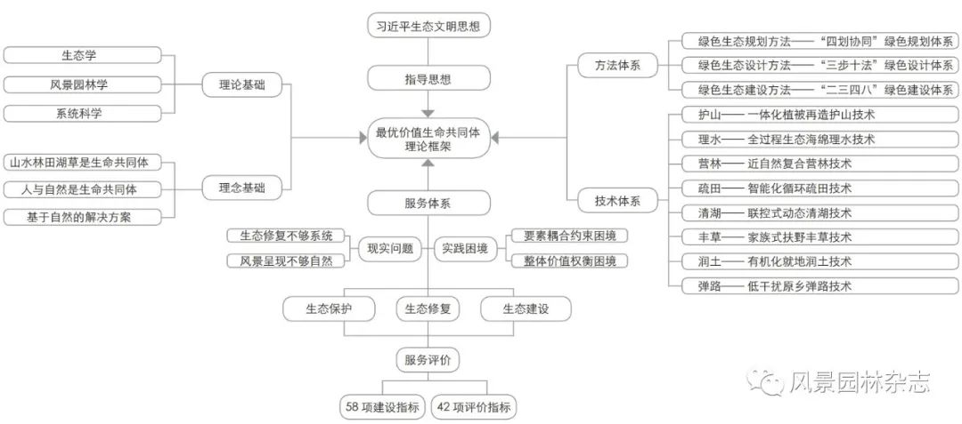 面对这些问题与困境,生态保护与修复领域亟须跨界融合,在现有理论支撑和学科基础之上,用系统科学的思维将生态学和风景园林学深度融合,按照习近平生态文明思想指明的生态文明建设目标、路径和方法,探索聚焦生态与风景、谋求满足生物多样性需求和人民美好生活需要的最优价值点,实现人与自然和谐共生的新时代生态文明建设的具体实践化新路子,以生态为“魂”、以风景为“象”的最优价值生命共同体理论应运而生(图1)。