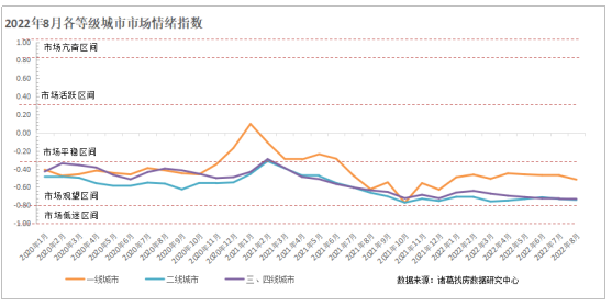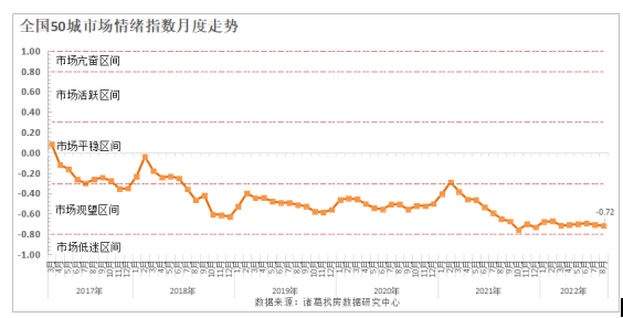 根据诸葛找房数据研究中心监测数据显示,2022年8月,重点50城市场情绪指数为-0.72,较7月下降0.01,仍位于市场观望区间。预计9月份随着烂尾楼风险逐渐出清,加上市场进入金九银十的传统旺季,市场情绪指数有望止跌回升。