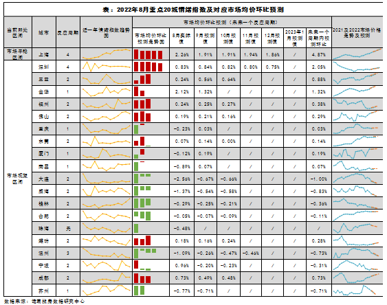 本月位于市场平稳区间只有上海一城,上海自从4月份由观望区间进入平稳区间,随后一直在平稳区间内小幅波动,尽管今年3、4月份受到疫情干扰,但市场情绪仍然较为坚挺,7月份情绪指数升至年内峰值,8月份受到整体行业环境影响市场情绪微降。从房价水平来看,8月上海市场均价为68271元/㎡,环比上涨2.26%,根据情绪指数模型预测,在未来4个月内上海市场价格将延续上涨态势,平均涨幅在1.5%-2%之间。