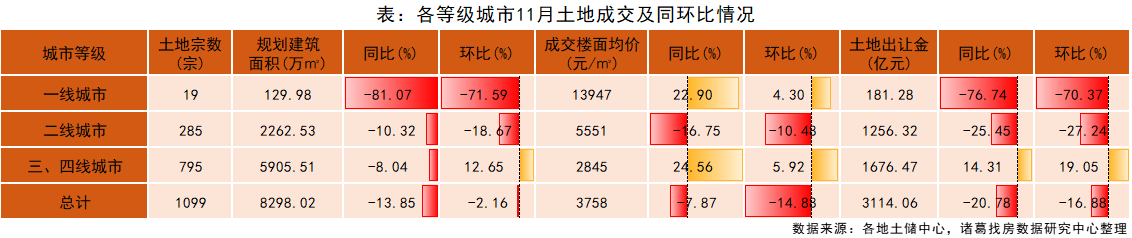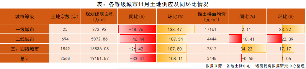 2、11月土地市场成交量价齐落,三四线城市成交持续上升