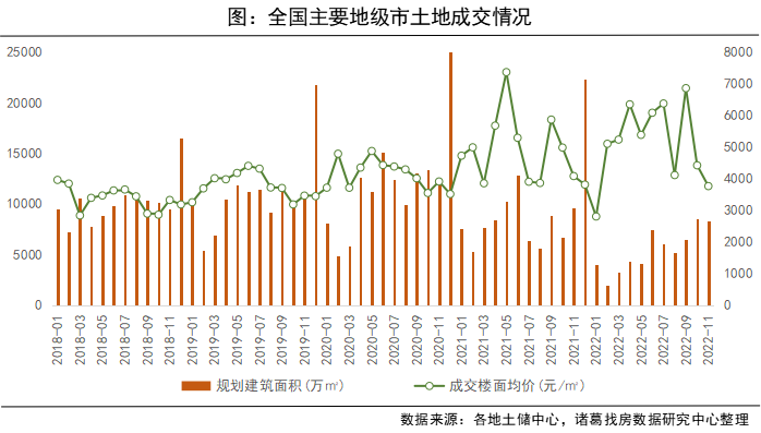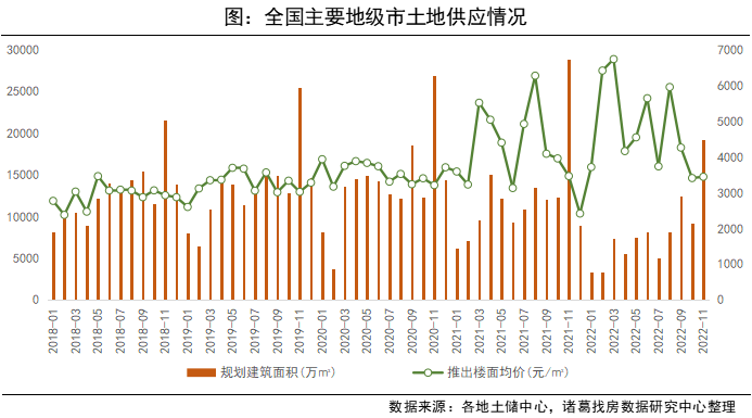 据诸葛找房数据研究中心监测,2022年11月全国主要地级市土地成交1099宗,成交规划建筑面积为8298.02万㎡,同比下降13.85%,环比下降2.16%;成交楼面价为3758元/平方米,同比下跌7.87%,环比下跌14.88%;土地出让金为3114.06亿元,同比下跌20.78%,环比下跌16.88%。本月虽有不少加推城市仍在继续推地,但大部分地块成交时间预估在12月,11月整体成交规模稳中有降。随着12月四、五批次土地成交,预计12月土地成交规模有望持续上升。
