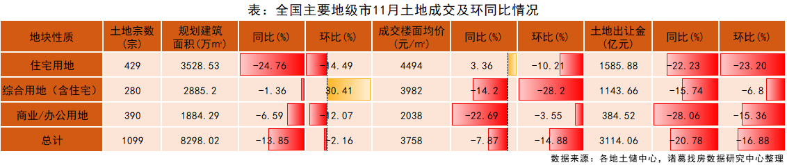从地块性质来看,11月纯住宅用地成交规划建筑面积为3528.53万㎡,同比下跌24.76%,环比下跌14.49%;综合用地(含住宅)成交规划建筑面积为2885.2万㎡,同比下跌1,36%,环比上涨30.41%;商办用地成交规划建筑面积为1884.29万㎡,同比下跌6.59%,环比下跌12.07%。从成交楼面价及土地出让金来看,各类用地成交楼面价及土地收金均较上月下跌。