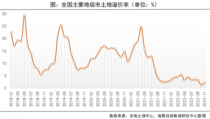 2022年11月全国主要地级市溢价率为2.16%,环比上升0.92个百分点,同比下降0.25个百分点。自去年5月起,土地溢价率高位回落,去年9月进入低位水平。本月溢价率止降转升。随着近期多项房企融资支持政策逐步落地,房企融资环境进一步改善,促进房企投资面恢复,房企资金端的利好直接传导至拿地市场,带动拿地积极性提升,此外,部分城市将供地质量提升,这也是房企拿地较为积极的一个重要原因。在本月北京、杭州等优质城市土拍热度显著回升的带动下,本月溢价率显露出回升迹象。在近期“三箭齐发”支持房企,缓解行业资金压力,预计下月房企拿地积极性将继续上升。