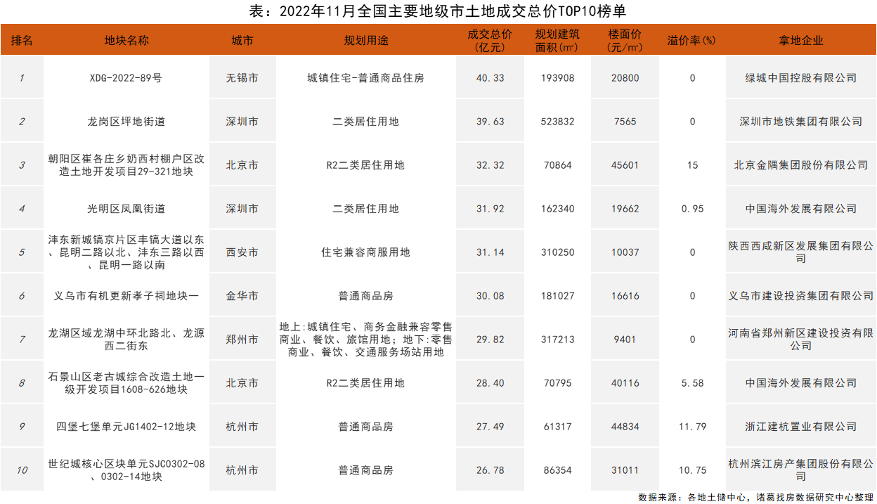 2022年11月城市土地出让金TOP10榜单中,无锡土地出让金达285亿元,如此亮眼表现主要归功于其第五轮集中土拍的稳健发挥,且成交规模较前2轮小幅上升,带动揽金规模占据高位。常州、淮安分别以219亿元、214亿元位居土地出让金第二、三位,2城凭借“量大”优势,收金表现也不俗。另外,除了依靠走量推高收金,还有靠“溢价走高”而上榜的城市,如北京、杭州,这2城于本月完成了各自今年的第四轮土拍,平均溢价率分别达到了10.02%、8.4%,11月土地出让金分别为135亿元、104亿元。