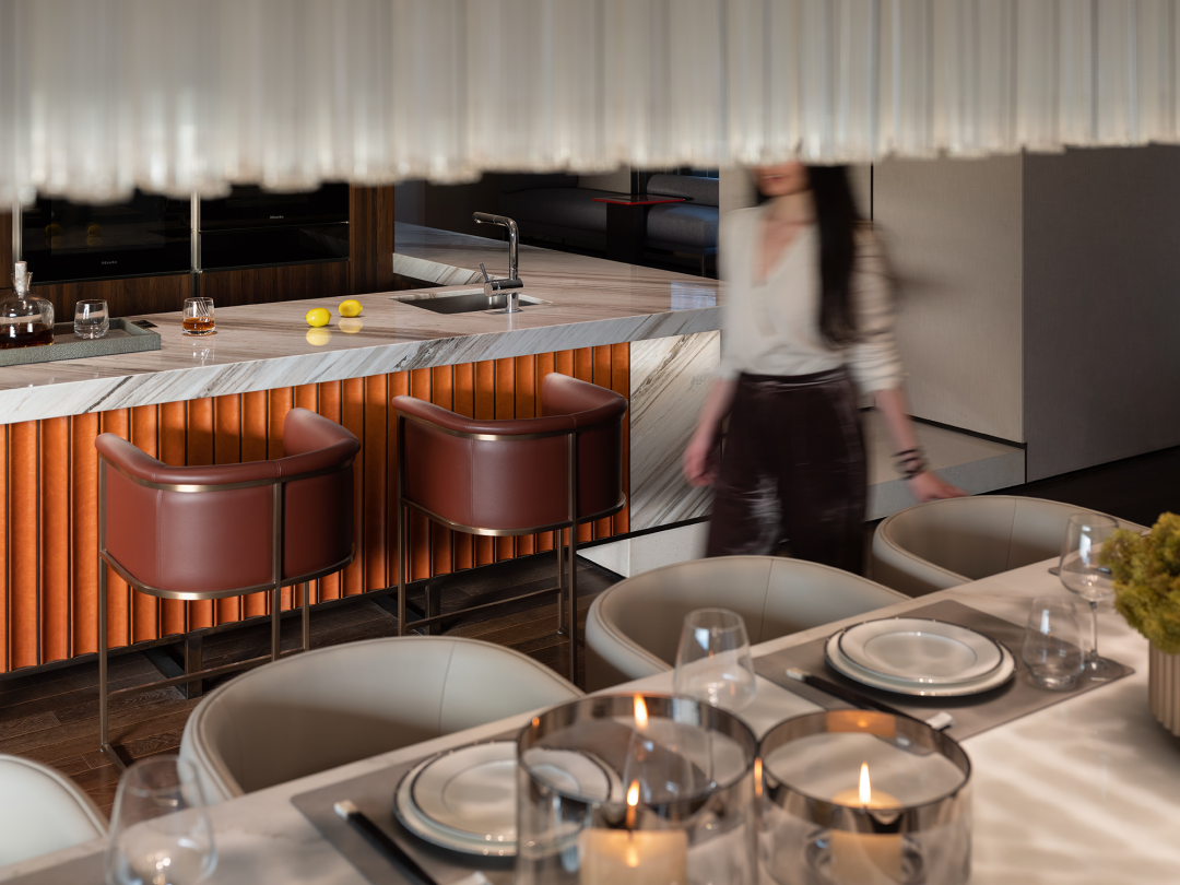 参照酒店式起居场景,于二楼构造枢纽之地,套间居室环绕。提取颇具东方意象的屏风形态,对沙发呈包裹姿态,并以此开启围合布局。内敛规整的低调秩序亦进一步描摹酒店气韵,透过阵列式陈设、高饱和色点缀,强化典雅之境。在深浅对比、错落有致中,仪式感与随性气息兼具。