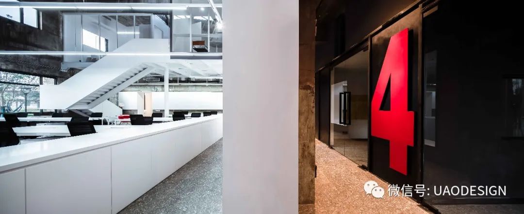 高空间的办公大厅和低高度的配套空间,构成了路易斯康所说的被服务与服务空间;设计在材质和色调上刻意做了区分,服务空间(包含茶水间、卫生间、模型室、打印室、会议室等)采用了黑色调,配以红色的数字走廊;而被服务空间(即办公大厅和前厅会议室等,则是以纯白为主色调的理性控制的空间调性);服务空间采用色温3000K的暖白光,而被服务空间则采用色温4000K的白光。
