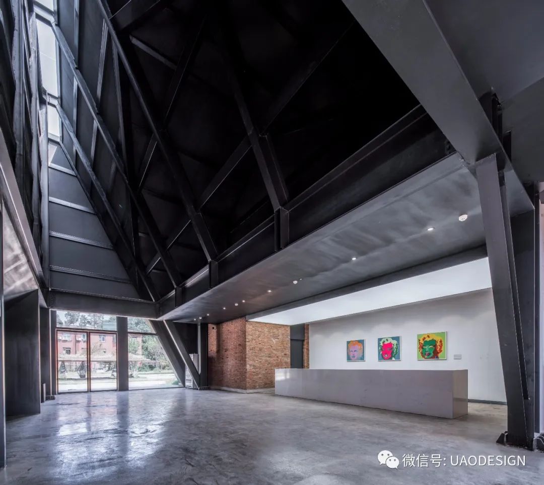 “A”是新植入的结构形态,它和保留的屋面、墙面形成了强烈新旧对比。“A”字顶部透过的玻璃天光,使黑色高耸空间不至于显得压抑
