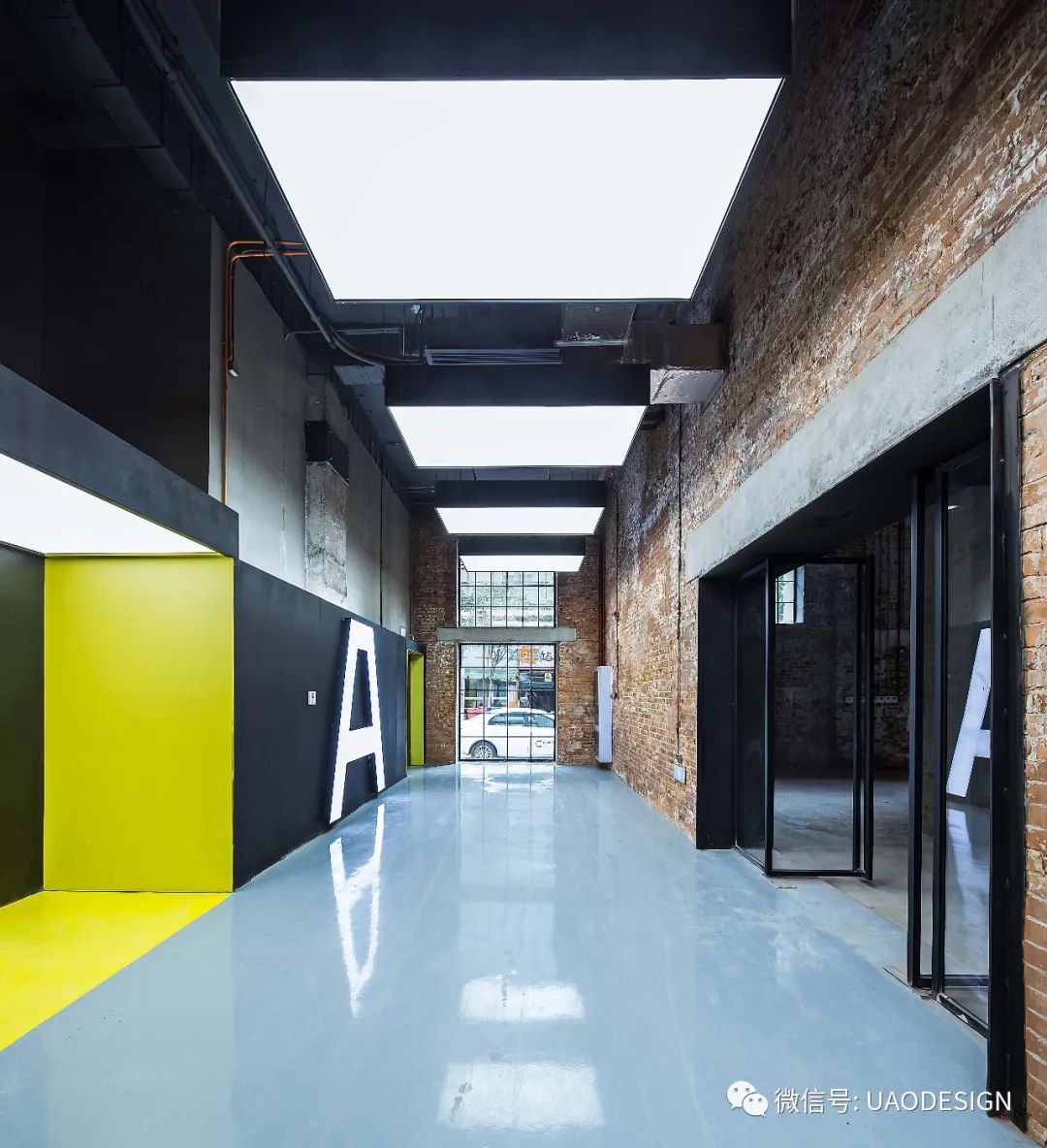 设计原则是强调对比和并置:主入口用钢结构形成高耸的外形;其斜向的屋面造型,来源于Art的第一个字母A。“A”字和外立面的橱窗造型D、C形成“Art Design Center”的首字母缩写,设计用波普的手法直接表达了ADC的意思。