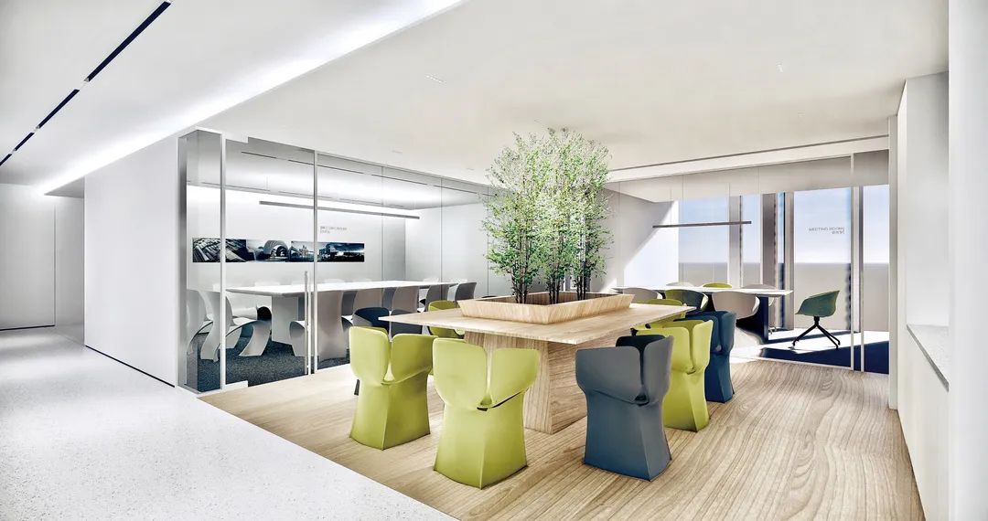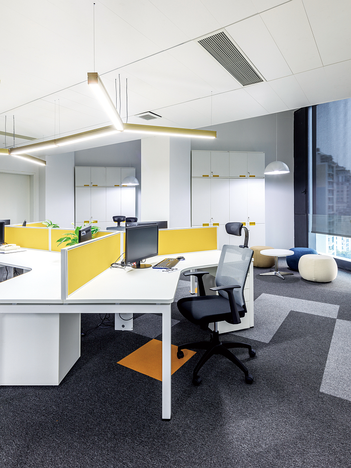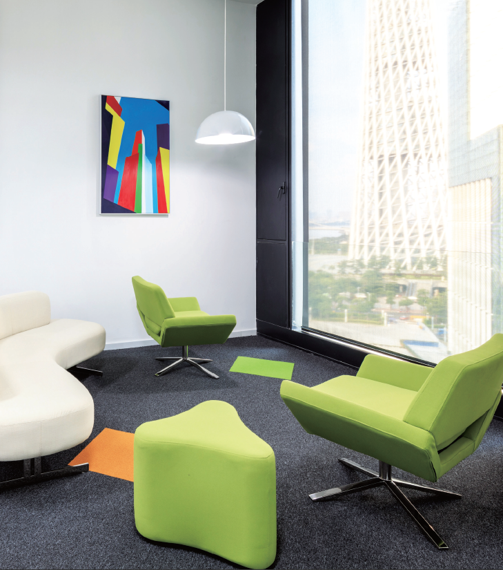 各种规模的会议室、接待室空间满足了各种的会议、接待需求,通过浅灰色、草绿色、橙色和黄色的重叠运用,再透过落地窗的设计介入户外阳光和景观,让空间呈现出和谐统一的平衡感的同时,创造出简洁而又充满张力的办公空间。