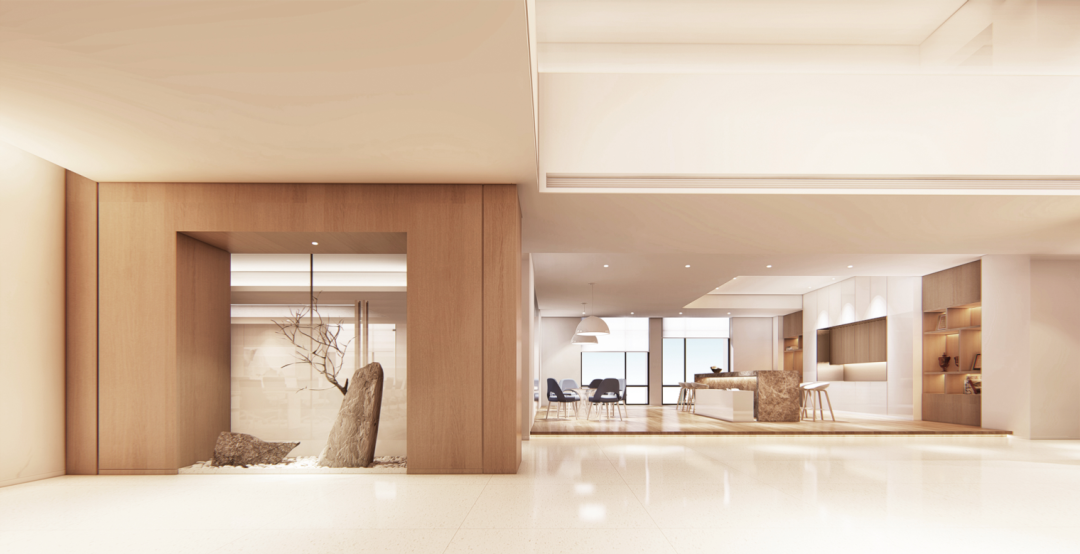 删繁就简,是一个过程,也是一种设计的创作思路。粗糙的朴石和枯树在空间灯光的映衬下疏影横斜,也给予人宁静淡泊的感受,与休闲的茶水吧的动态日常形成了强烈的对比,却又如诗如画般地融入空间的每一处肌肤里。