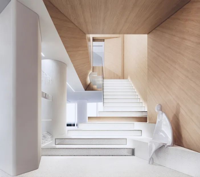 十层办公楼的中央是企业文化的精神堡垒,设计师遵循空间构建的美学关系,通过将自然纯净的白色与温和的木质、沉静的大理石相结合,将品牌形象简洁明了地呈现,和谐统一的空间视觉让空间拥有了结构美和秩序美。