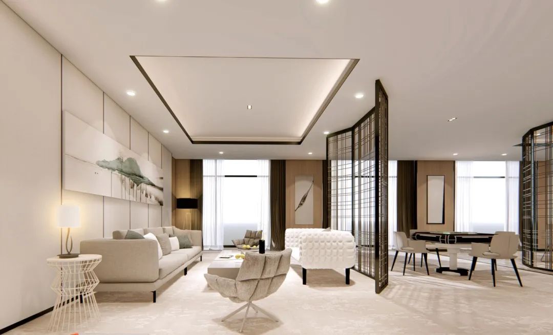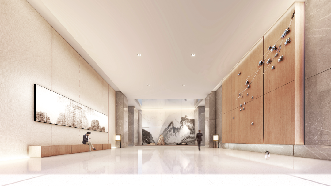 一楼大堂的空间在设计师淡雅明净的笔触下晕染开来,米色色调的运用让空间凝结出静谧优雅的气质,泼墨的山水画让空间增添了人文美学的气息,以木质材料为代表的柔和色调让空间充满了无限的遐想,这是一种摒除复杂的优雅,与行文需要繁简得当同理,空间也需要这种现代性的“去复杂”。