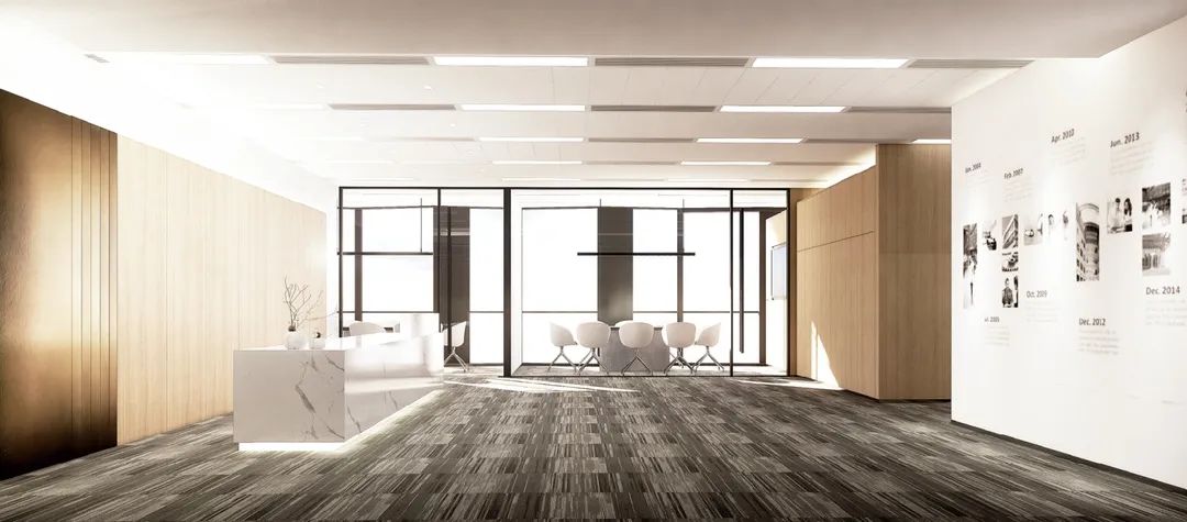 设计延续办公室空间长期奉行的理性主义语汇,简洁有力的玻璃、大理石、木质材料成为项目设计的主体。办公室前台空间区域选用了自然纯粹的大理石材质设计而成的接待长桌,与背后原木质地的背景墙以恰到好处的对话关系来表达空间的干练感,亦能让身处其间的人,能以一种沉静务实的精神面貌投入工作。