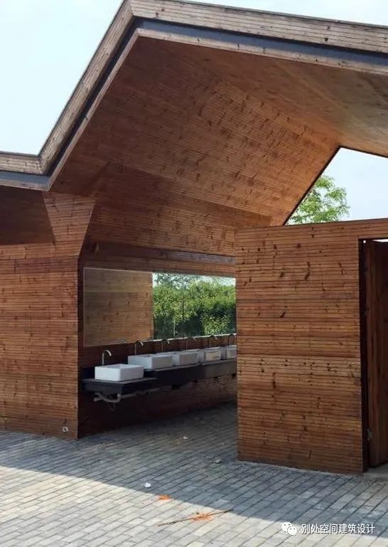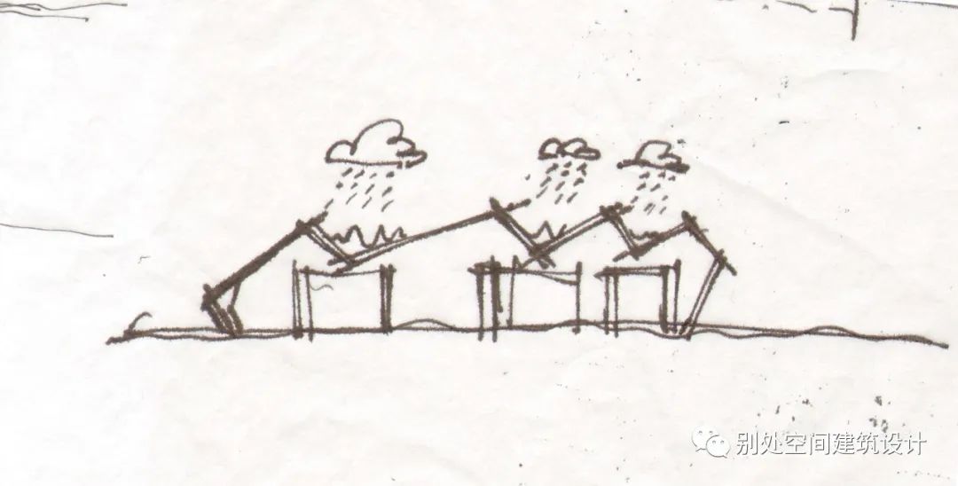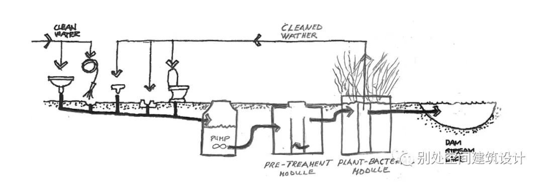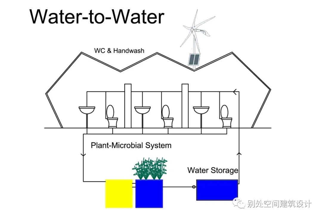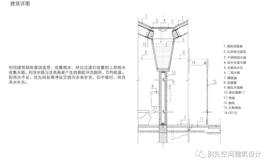 倾斜的屋顶,收集雨水。雨水经过过滤槽后,汇集到屋顶下部的雨水收集水箱。利用水箱与洁具高差产生的势能冲洗厕所。所有厕所用水经过净化后得到的干净水再供厕所使用,形成水资源的循环。别处空间的这项技术获得国家实用新型专利。