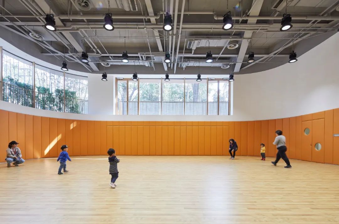 剧场舞台则又是另一个空间——室内体育场的入口。占据了两层空间的室内体育场既是孩子们课时的室内活动空间,也是幼儿园平常举办全园艺术活动、体育活动的场所。