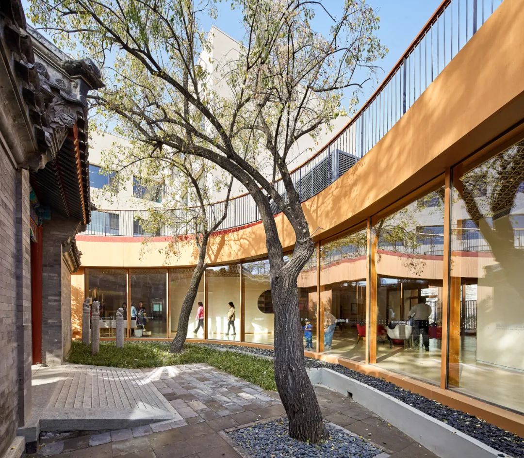 阳光通过整墙落地玻璃射进室内,人们也可在此近观室外的古四合院。新旧建筑间近三百年的线性历史在这里变得立体。