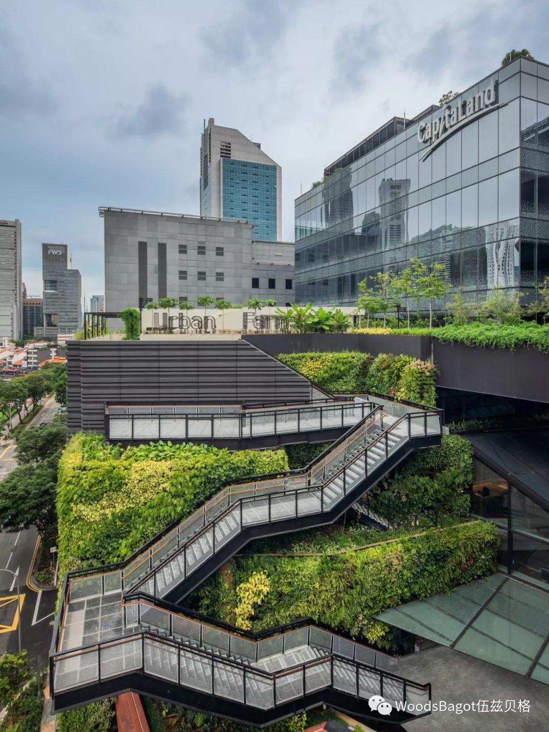 Green stairs, which nurture exercise andmovement, lead from the Connector Floor to Level 7, which is home a 5,000 square foot rooftop urban garden, the largest in Singapore's CBD. There is also a 18,000 square foot food garden, a futsal court and outdoor leisure space. Additionally, the office blocks on the upper levels have external stairs that provide easy accessibility to green spaces and promote wellness.