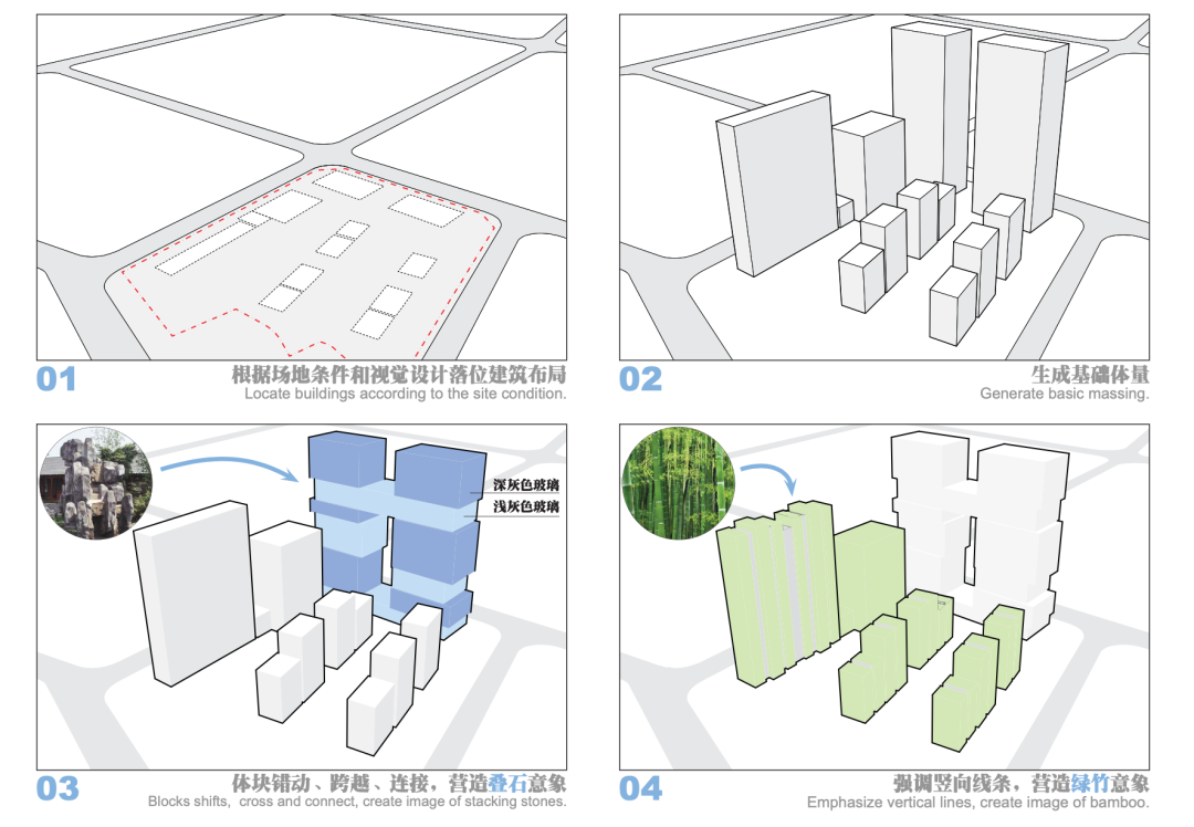 设计从豫园、古漪园等上海古典园林中提取了叠石、绿竹为概念元素,叠石理水,天然自若;绿竹猗猗,君子气节。设计将其分别演化运用到办公、住宅的立面设计之中,在视觉上既让各功能间相互独立,又形成设计的内在关联,形成风格一致的有机整体,传承最深层次的地域文化内涵。
