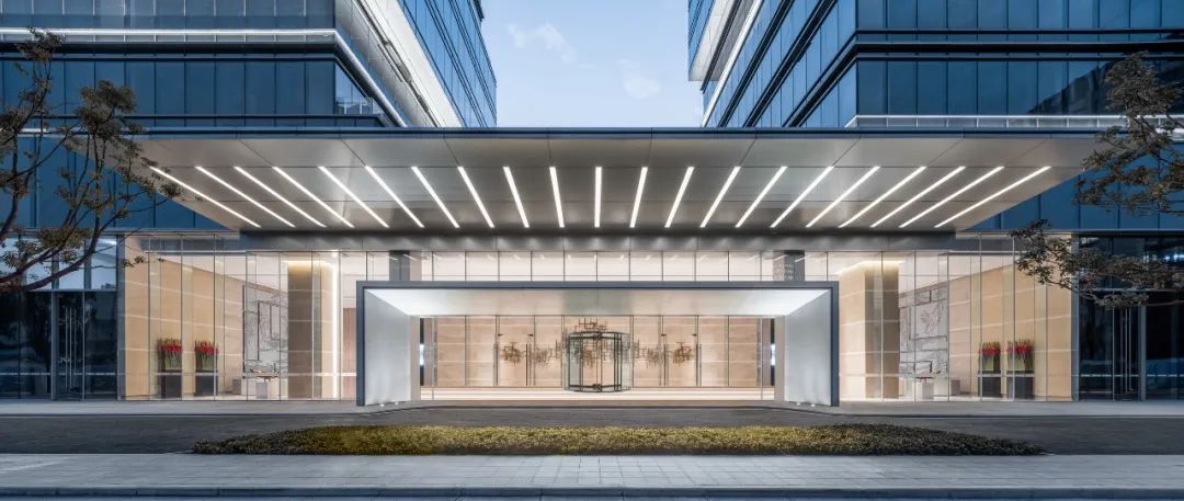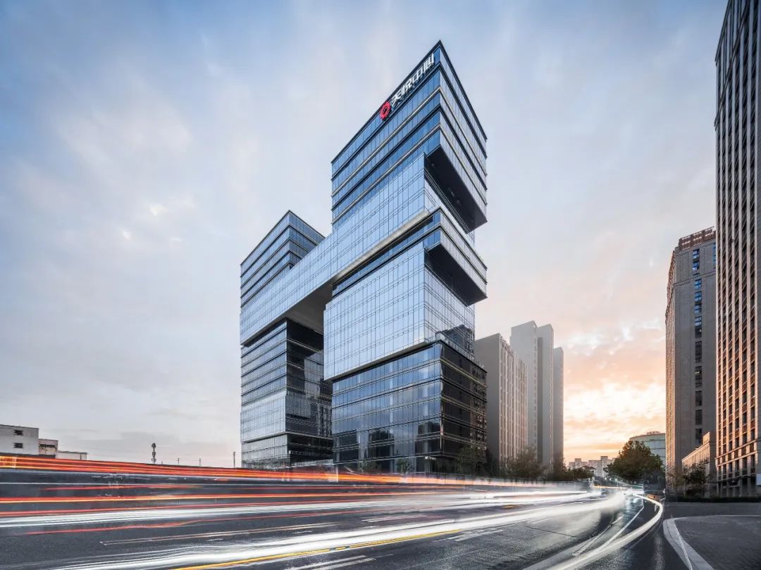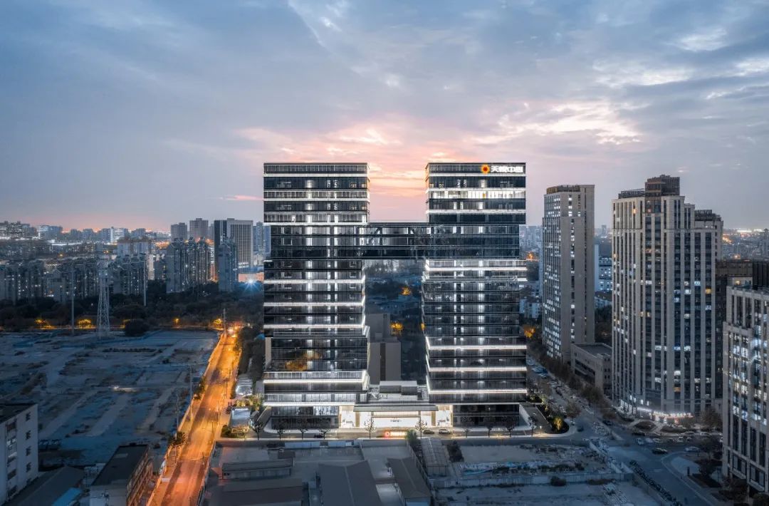 办公塔楼通过错动、跨越的体块,以及体块间深浅灰色相间的玻璃幕墙,一同模拟叠石错落退进的轮廓,并通过白色的灯带强化参差感,在夜幕中形成标志性的城市景观。