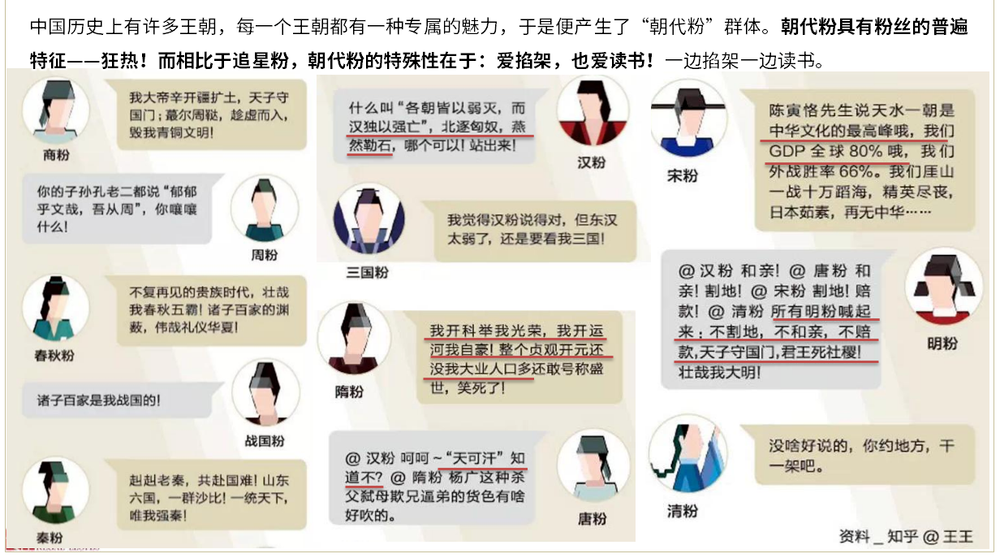 过去,我们把爱好历史的人统称为历史迷,现在,历史迷成了一个很笼统的概念,这类人群有了更细的划分,他们被称为“朝代粉”。中国历史上有许多王朝,每个王朝都有一种专属的魅力,于是就产生了“朝代粉”群体。相较于追星粉,“朝代粉”的特殊性在于:爱掐架,也爱读书!这些人可以说是一边掐架一边读书。刚才我提到过的“汉粉”就是其中的一支,《大漠谣》事件,使得“汉粉”一战成名。