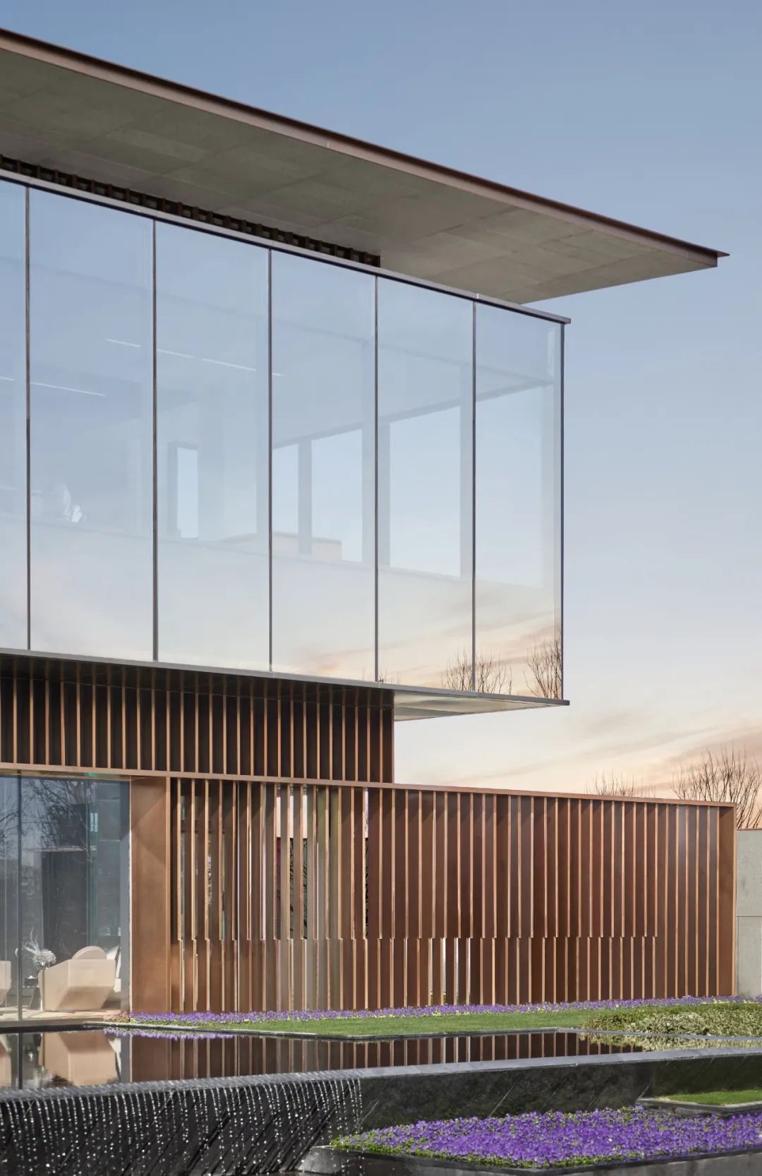 从远处走来,二层的玻璃盒子仿佛漂浮于半空之中,金属格栅的加入赋予建筑大胆的戏剧张力,凸显建筑的昭示性与瞩目感,在光影的映照下,虚实变化的动感韵律被表现的淋漓尽致。