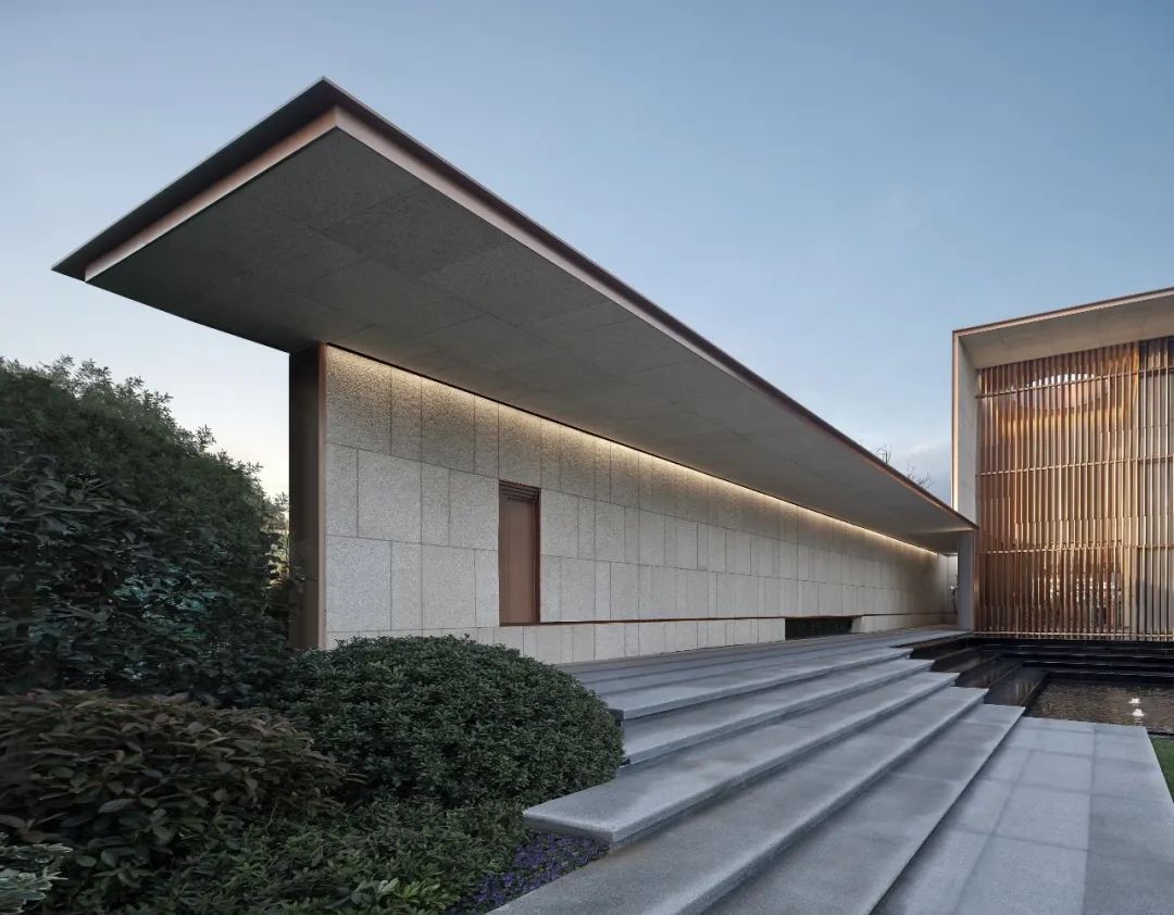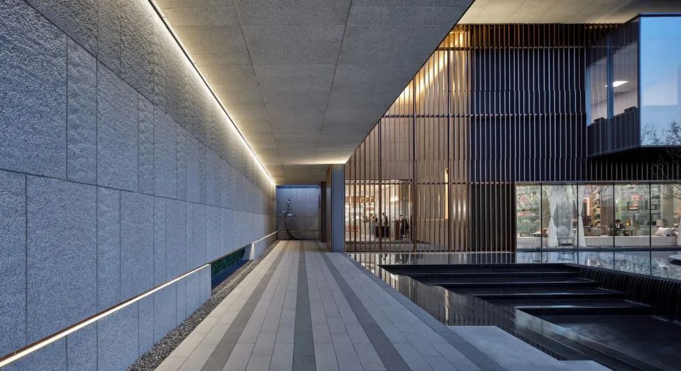 抬升的台阶巧妙的消解城市道路与地块的高差,引导人们走向半开放的廊道空间,视线和空间的收紧传递轻松而不失稳重的感官体验。