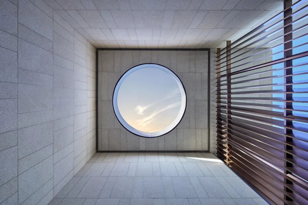 廊道的尽头便是一尺见方的过厅,阳光从穿过顶部洒落在围合的金属格栅上,静谧、明亮的建筑空间成为人与自然交流的空间载体。