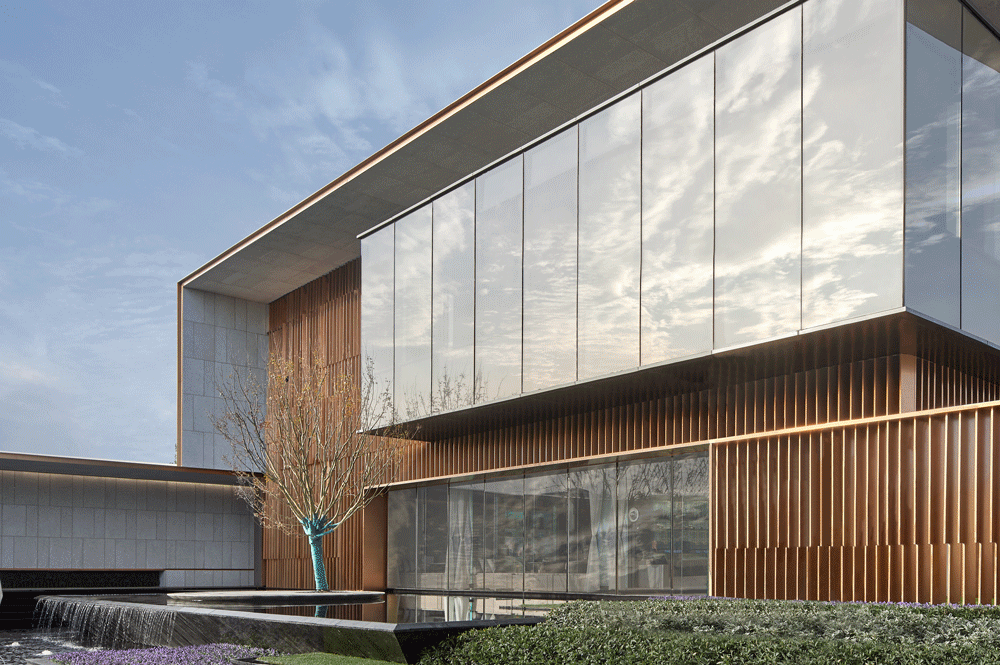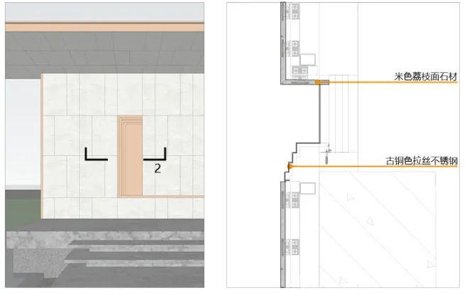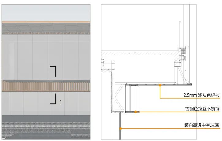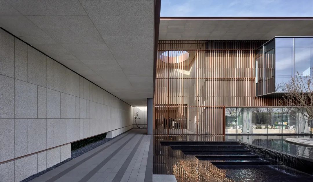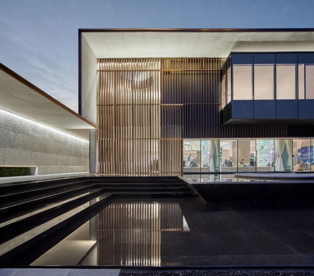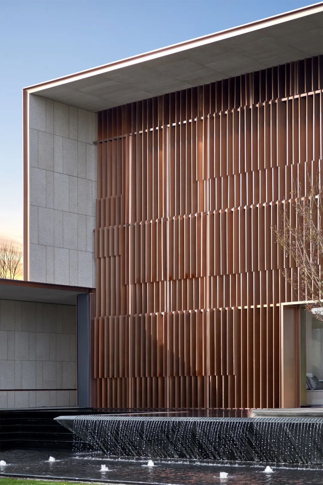 同时,为了营造格栅语言的立体感和层次感,设计师进行了反复的推敲分析,最终通过平面层次上的切割,格栅角度的旋转变化与立体层面上的凹凸重组,强化造型感,突出入口空间的仪式感。