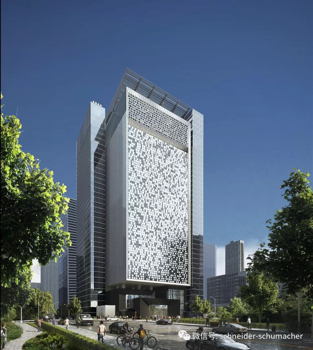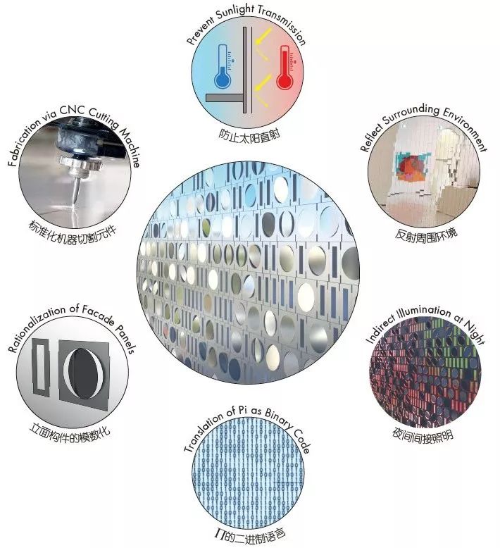 我装载着整个前海的数据,也承载前海乃至整个粤港澳大湾区的未来。我代表着数据的不断升级,科技的永无止境。用数字“π”代表这种无限升级,不断进化的状态,也预示着对未来科技及信息技术领域的美好期待。在立面上用计算机领域最基础的数字0,1,编织 “π” 的二进制语言。