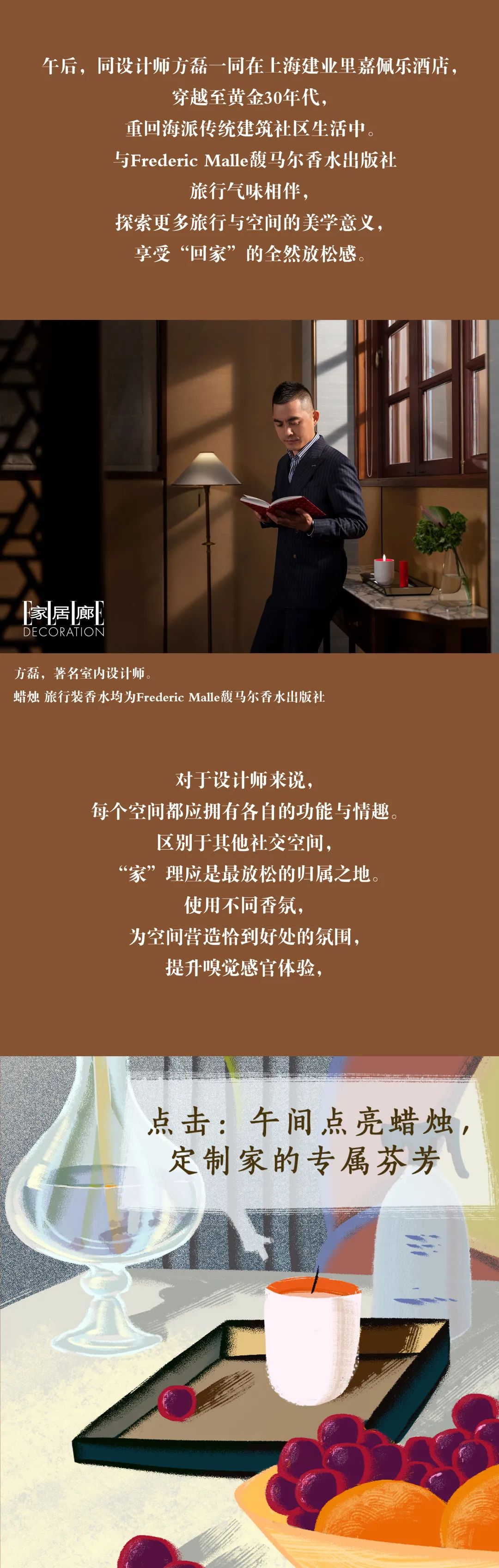 正值馥马尔香水出版社走过的第一个20年,设计师方磊受《ELLEDECO家居廊》之邀,携手Frederic Malle 馥马尔家居香氛系列,探索生活与品质下的嗅觉惊喜,这亦是他对美与艺术的一次全新尝试。